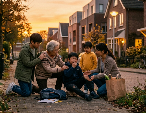 할머니는 망설임 없이 준이를 일으켜 세우고 괜찮냐고 물으며 자신의 전화를 빌려주었다.