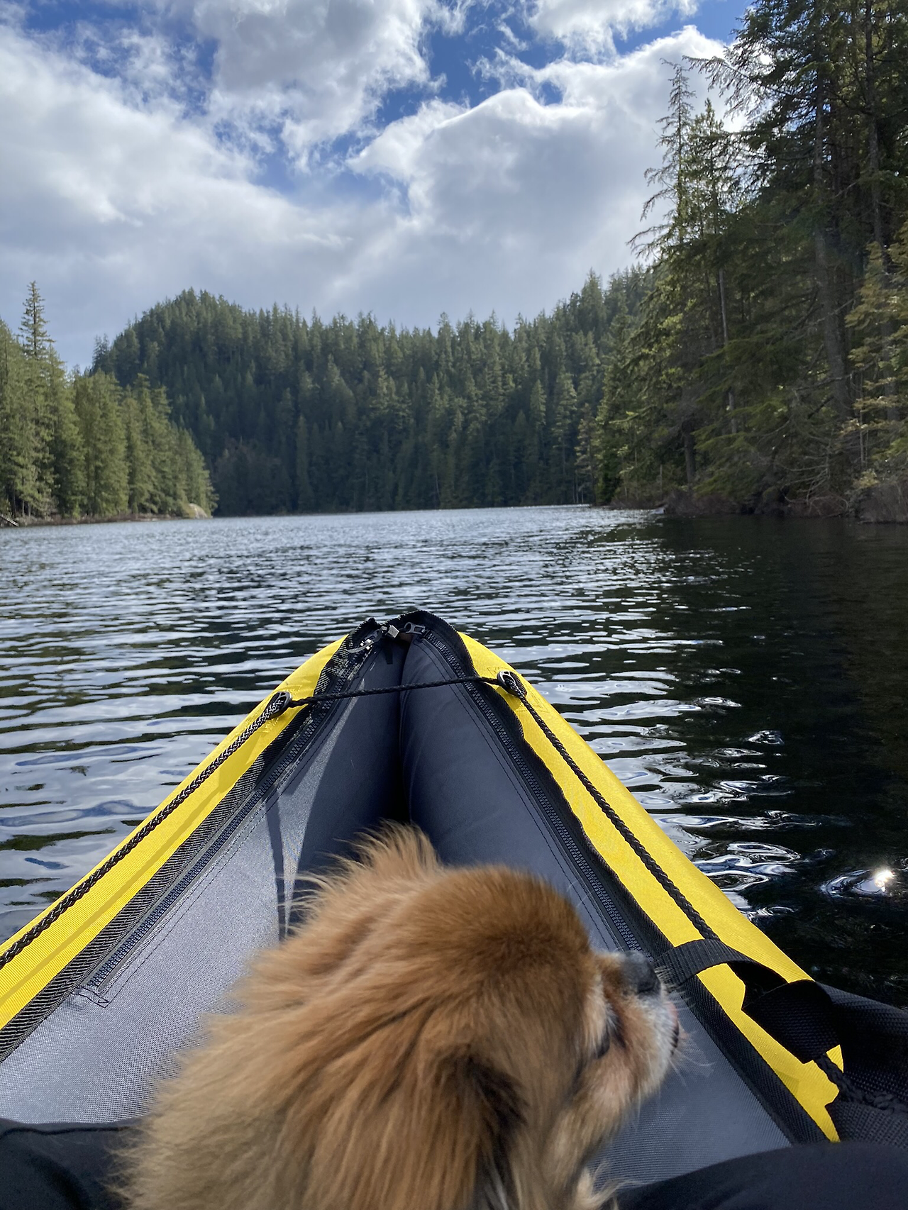 호수 한가운데 둥둥 떠서 둘러보는 주변 나무들과 하늘, 구름은 정말 환상이다. 오리들도 옆에서 지나가고 가끔 흰머리 독수리도 멋지게 하늘을 가른다. 지루할 수도 있겠다 싶었는데 이쪽저쪽 탐험하다 보면 한 시간이 금방 간다. 같이 간 강아지도 처음엔 무서워하더니 어느 순간 즐기고 있다. 정말 잘 샀다 싶다.