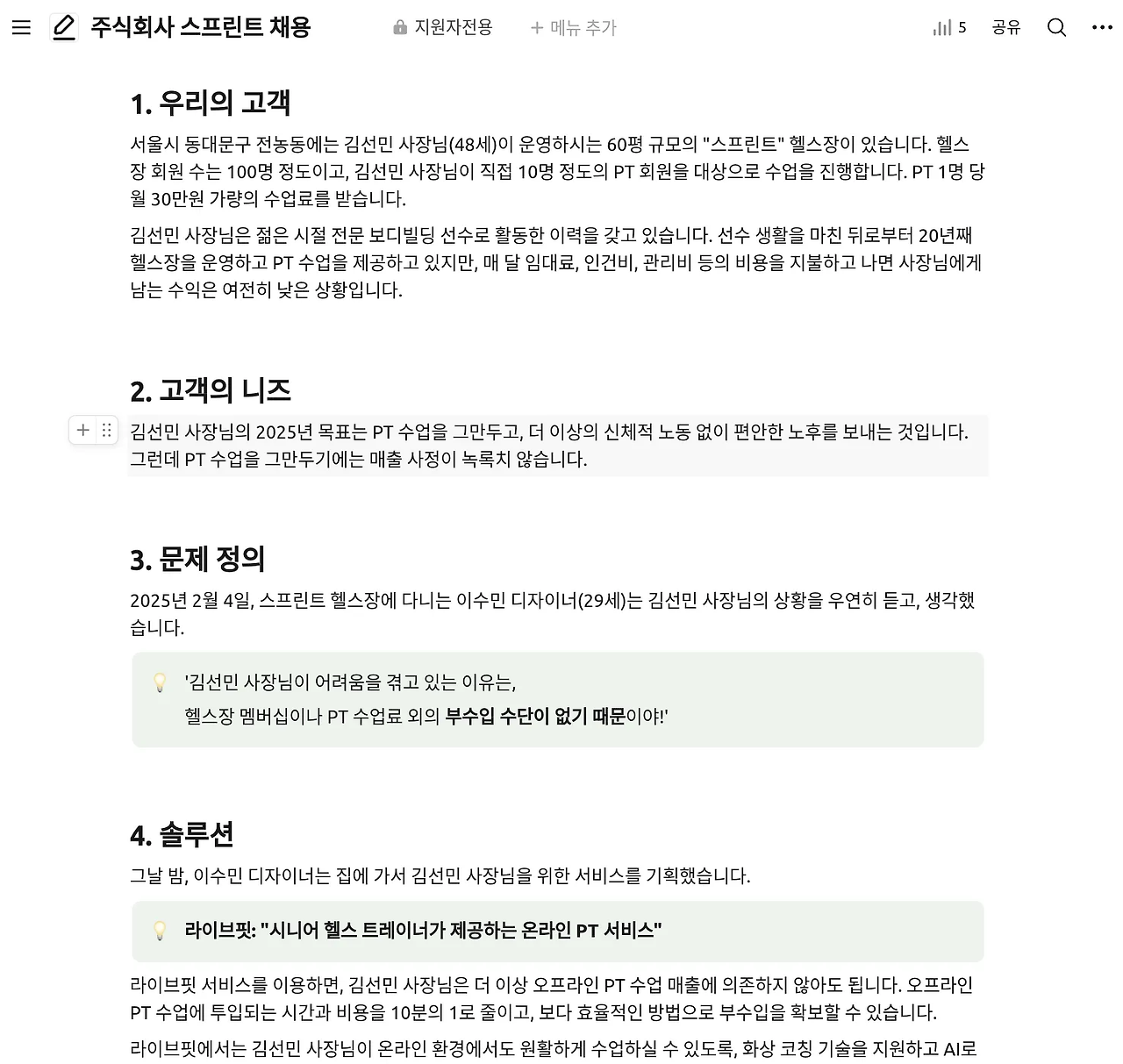 회사에서 필요한 역량을 검증하되, 무료 노동 문제를 방지하기 위해 채용 회사의 비즈니스에 활용되지 않는 가상의 인물과 상황을 설정하는 case 기반의 유사(mock) 테스트를 제공했습니다.