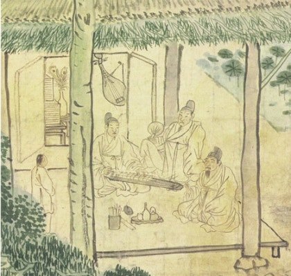 지금으로부터 240년 전, 사람들이 마루에 모여 앉아 거문고 연주를 듣는 모습이 보입니다.