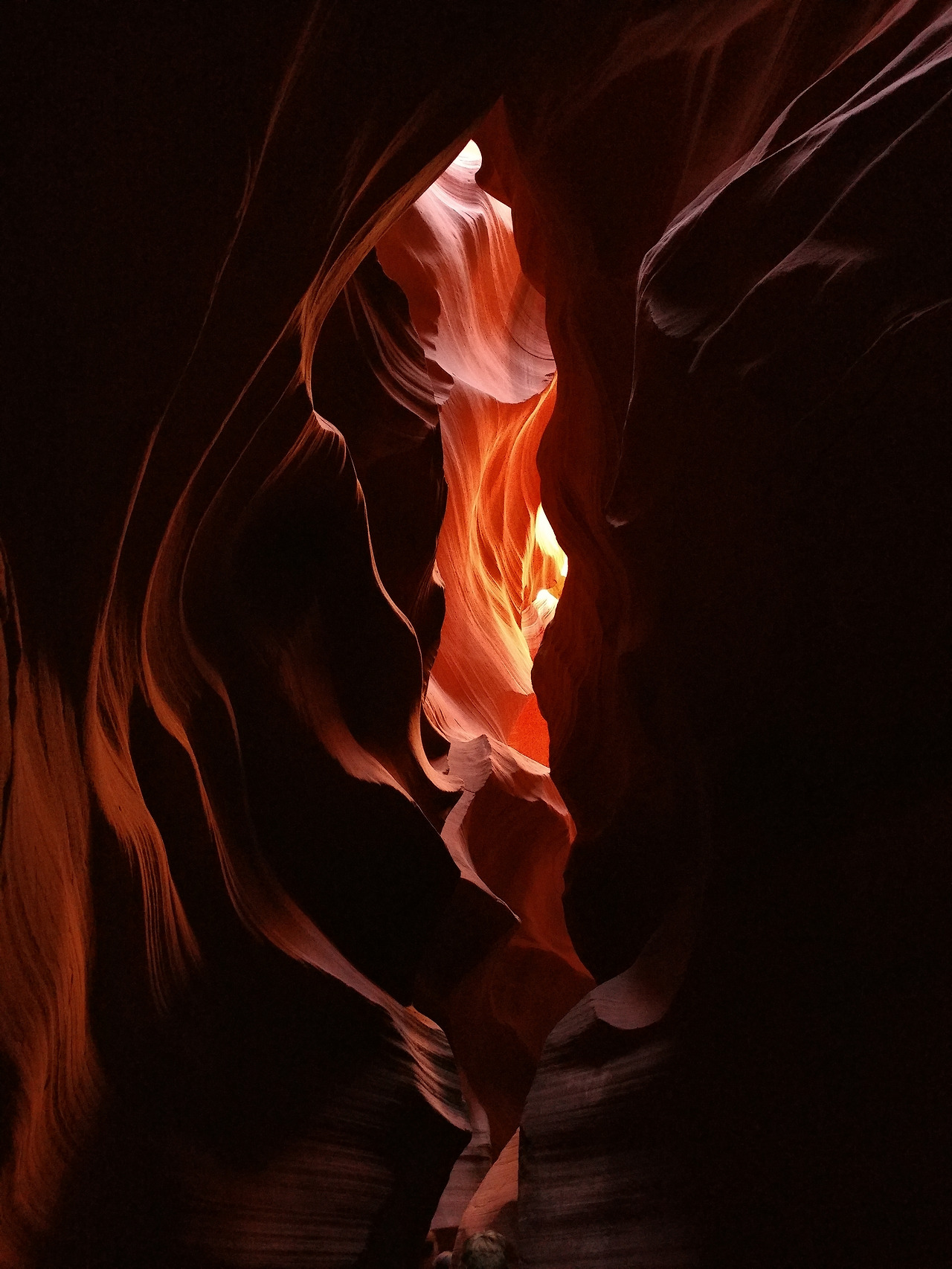 그 이유는 눈에 담기는 곡선의 명암 때문이었다. 이른 오전 시간, 적당히 기울어진 햇빛은 앤텔로프 캐니언에 완벽한 명암을 만들어냈다. 시작은 고요했다. 빛은 상층부의 곡선들에게 모두 가려지고, 아래 남은 것은 잔잔한 어둠뿐이었다. 그러나 무겁지는 않았다. 조금씩 은은하게 들어오는 빛과 합쳐진 어둠은 그곳을 고요하고 차분하게 만들었다.
