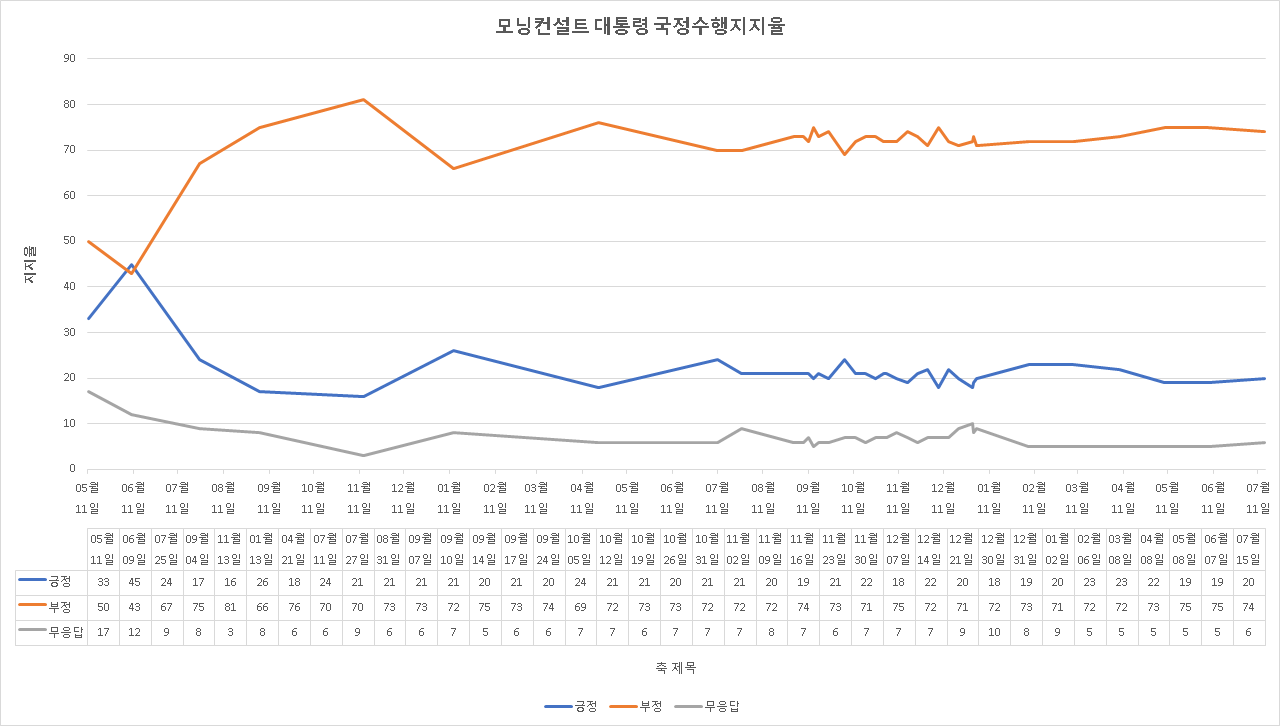 2024년 7월 15일 발표한 모닝컨설트 尹 지지율은 긍정 20%, 부정 74%