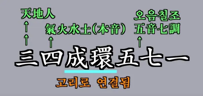 三 = 天地人, 四 = 氣火水土(本音), 成環: 고리로 연결됨, 五七: 오음칠조五音七調