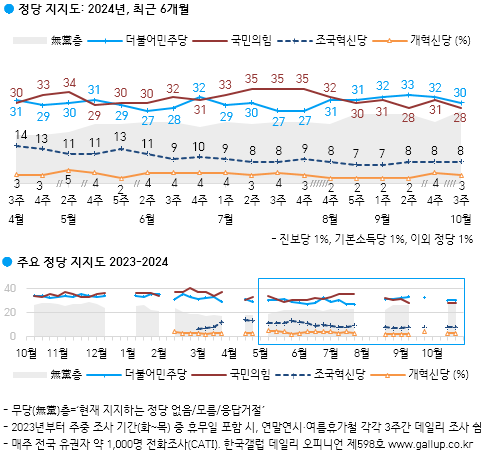 2024년 10월 셋째 주(15~17일) 현재 지지하는 정당은 국민의힘 28%, 더불어민주당 30%, 조국혁신당 8%, 개혁신당 3%, 진보당, 기본소득당, 이외 정당/단체 각각 1%, 지지하는 정당 없는 무당(無黨)층 27%다. 국민의힘 경선 이후 양대 정당 비등한 구도가 이어지고 있다.