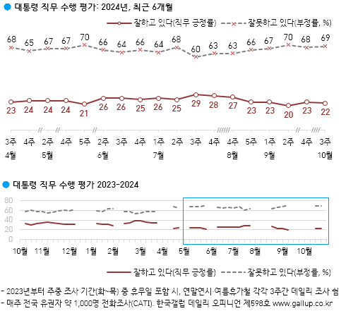 한국갤럽이 2024년 10월 셋째 주(15~17일) 전국 만 18세 이상 유권자 1,001명에게 윤석열 대통령이 현재 대통령으로서의 직무를 잘 수행하고 있다고 보는지 잘못 수행하고 있다고 보는지 물은 결과, 22%가 긍정 평가했고 69%는 부정 평가했으며 그 외는 의견을 유보했다(어느 쪽도 아님 3%, 모름/응답거절 6%).