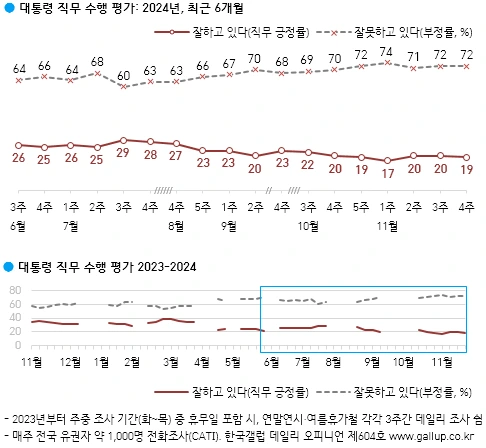 ‘‘한국갤럽’의 대통령 지지율은 ‘아무 하는 일 없이’ 저절로 상승하는 이상현상에서 벗어나 다시 10%대로 떨어졌다.’한국갤럽‘이 2024년 11월 넷째 주(26~28일) 전국 만 18세 이상 유권자 1001