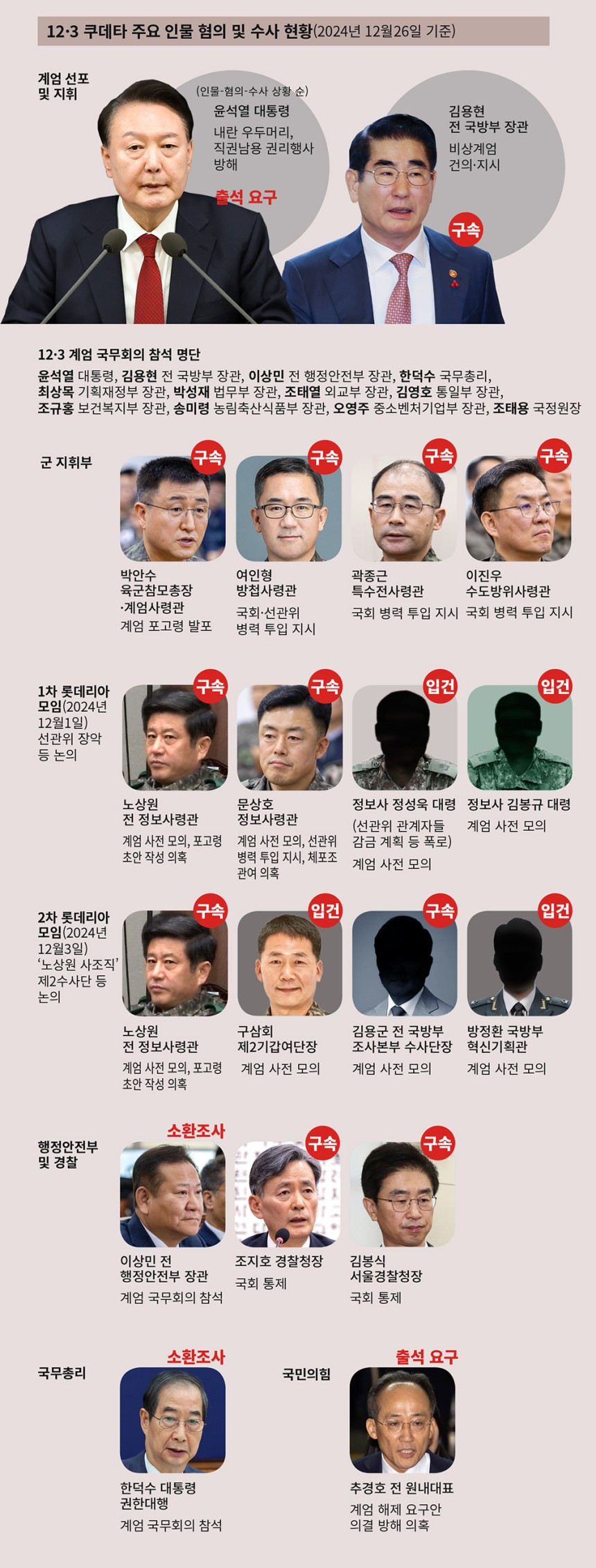 123쿠데타 주요 인물 혐의 및 수사 현황(2024년 12월26일 기준)