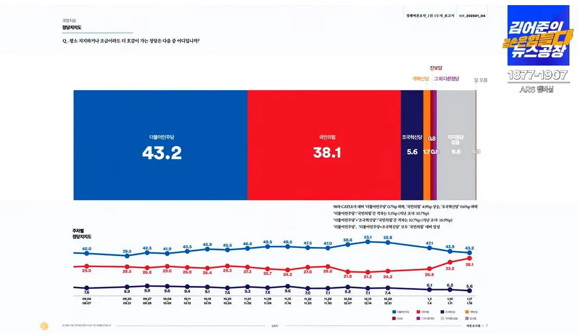 여론조사 꽃 정당지지율 민주43.2%, 국힘38.1%