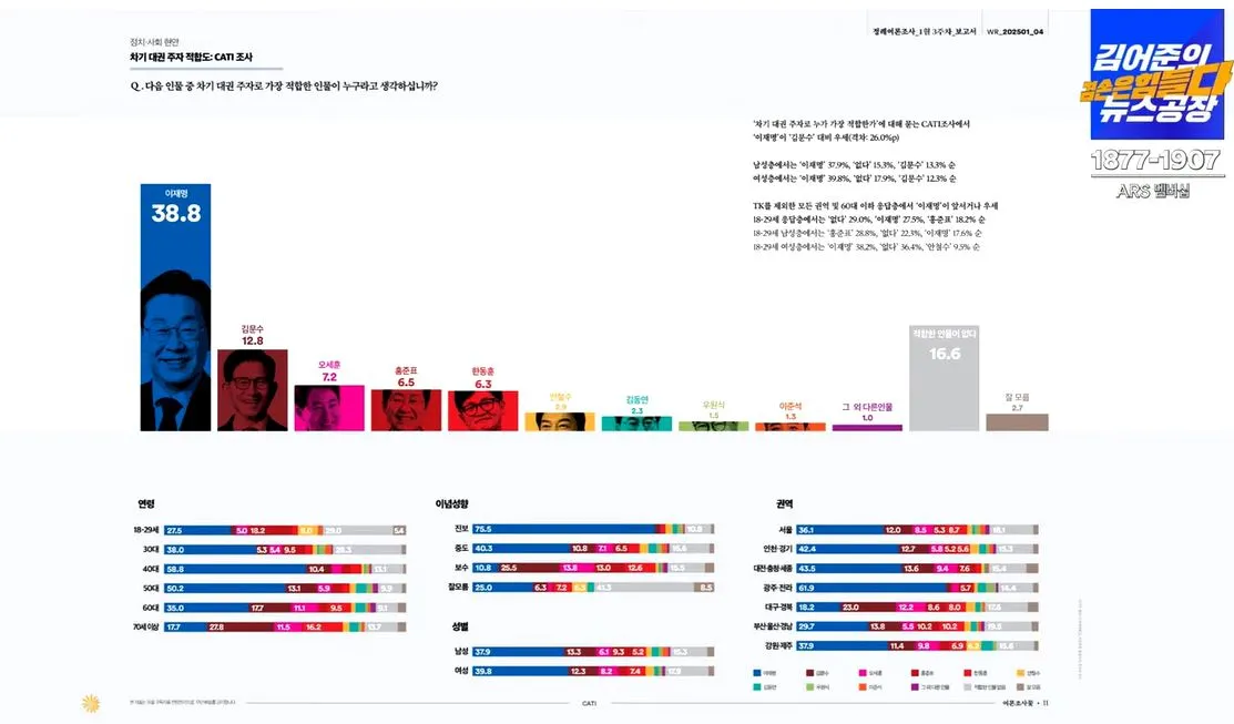 차기대선주자 적합도 이재명 38.8% 김문수 12.8%