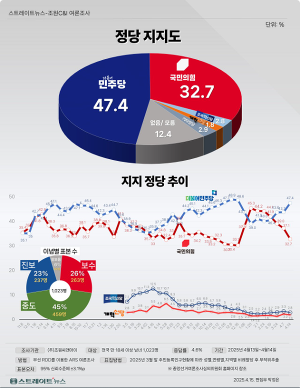 [조원씨앤아이 여론조사] 민주당 지지율 급등, 국민의힘에 15%p 차 우세