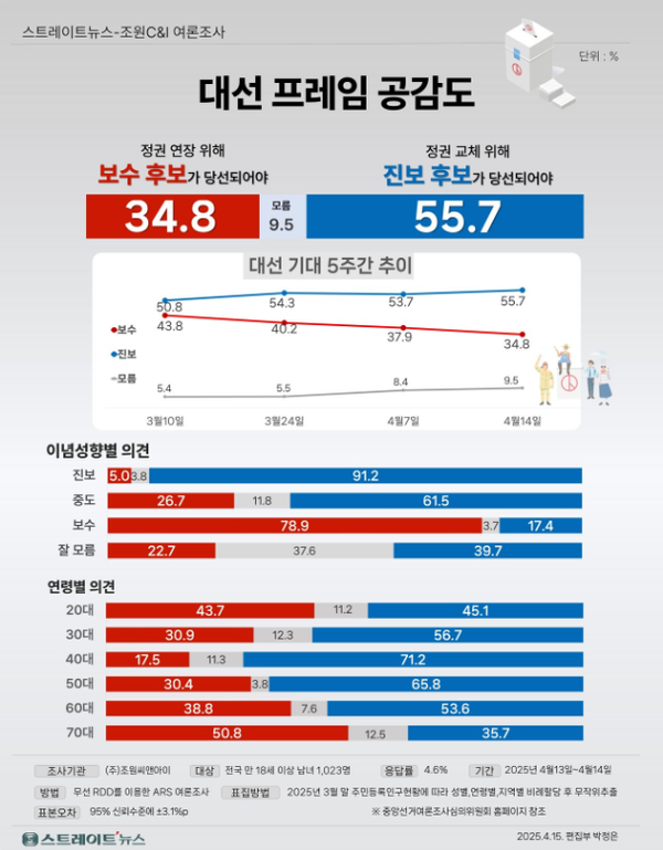 대선 프레임 공감도 조사, '정권 교체 위해 진보 후보 당선' 55% 이상