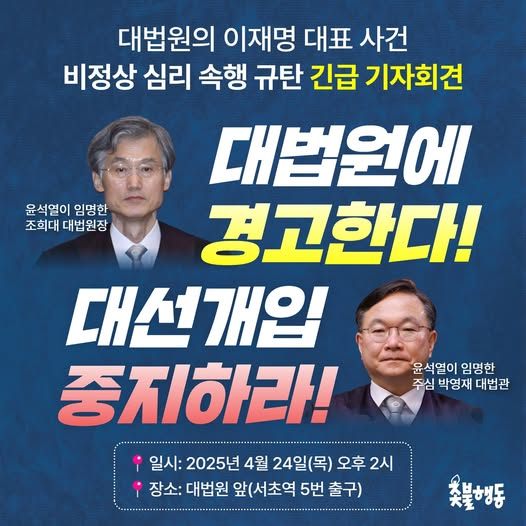 - 이에 촛불행동은 현 시국을 비상한 상황으로 보고 대법원에서 긴급 기자회견을 진행하며, 전국 지방법원 앞에서 동시다발 기자회견을 진행할 예정입니다.