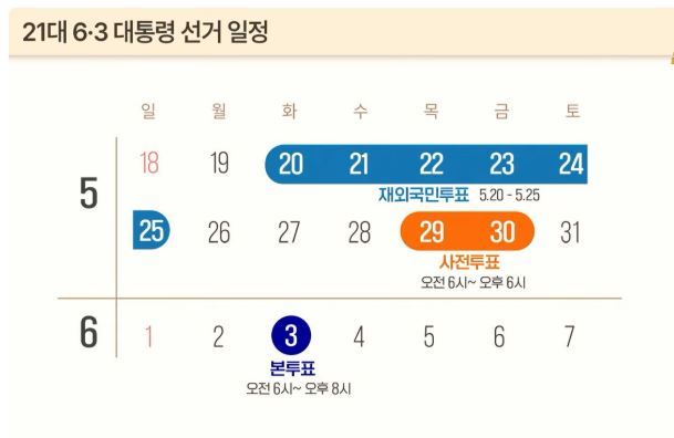 - 대선 본 투표는 6월 3일 투표 시간은 오전 6시부터 오후 8시까지