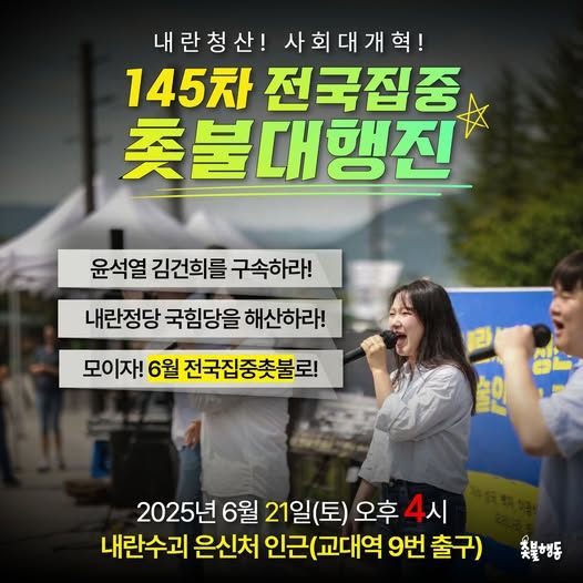 내란청산 사회대개혁 145차 촛불대행진을 6월 전국집중 촛불로 진행합니다.