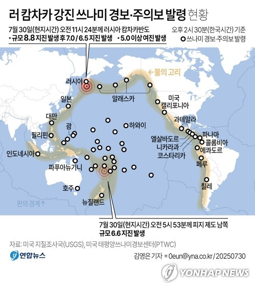 日태평양 지역에 쓰나미 경보·대피령…캄차카반도 8.7 지진 영향