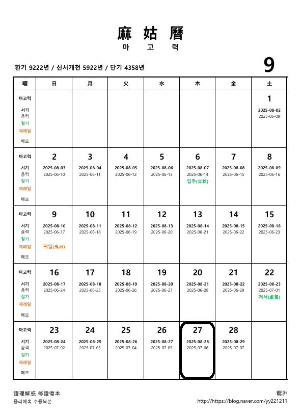 환기 9222년/신시개천 5922년/단기 4358년 9월 27일 木/서기 2025년 8월 28일