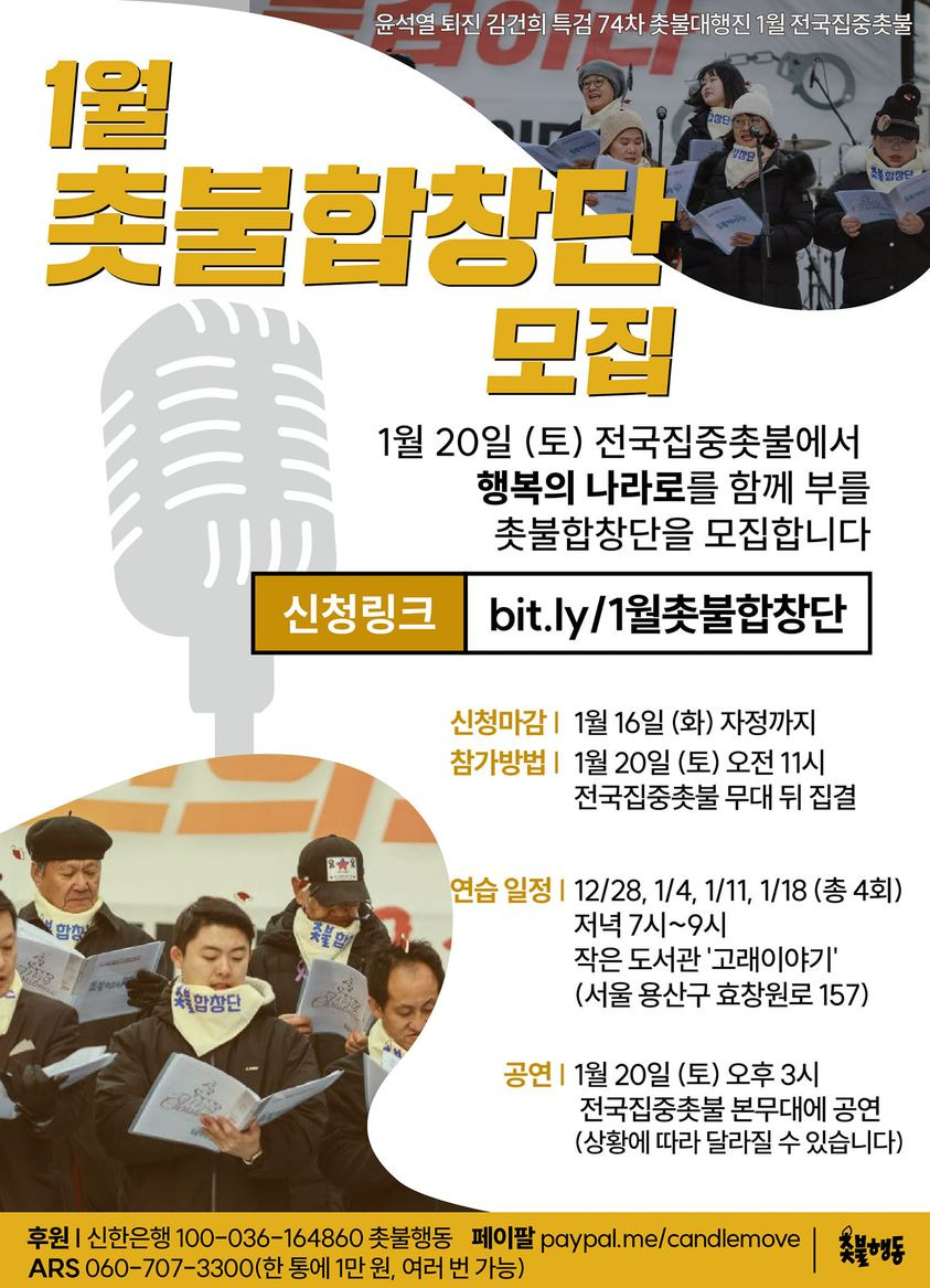 1월 20일 (토) 전국집중촛불에서 “행복의 나라로”를 함께 부를 촛불합창단을 모집합니다.