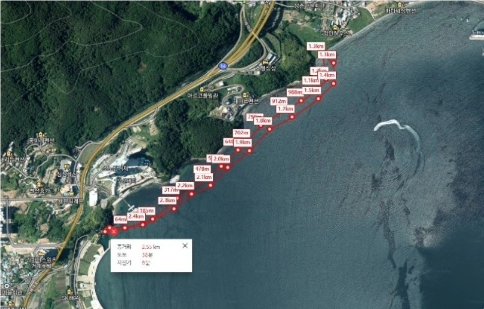 도상으로는 왕복 2.5km정도 남짓 거리다. 그리 길지 않을 뿐더러 수영에만 집중하면 한시간 남짓이면 충분한 시간이다.
