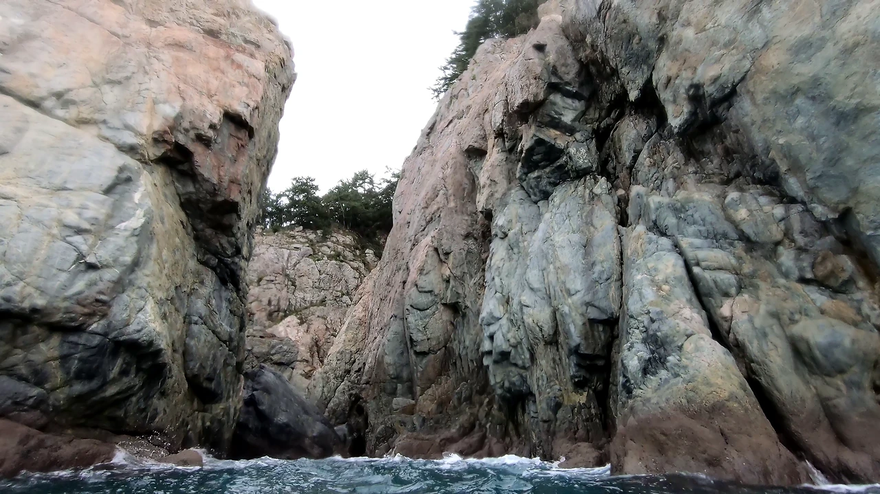 만장일치로 입수를 결정하고 방파제를 빠져나간다. 걱정은 했지만 그렇다고 그리 나쁘지도 않았다. 파도가 높긴 했지만 처음부터 멀미가 날 정도는 아니었고 방파제 뒤에 숨어있는 깎아지른 절벽은 사람의 마음을 홀리기에 충분하고도 남았다.