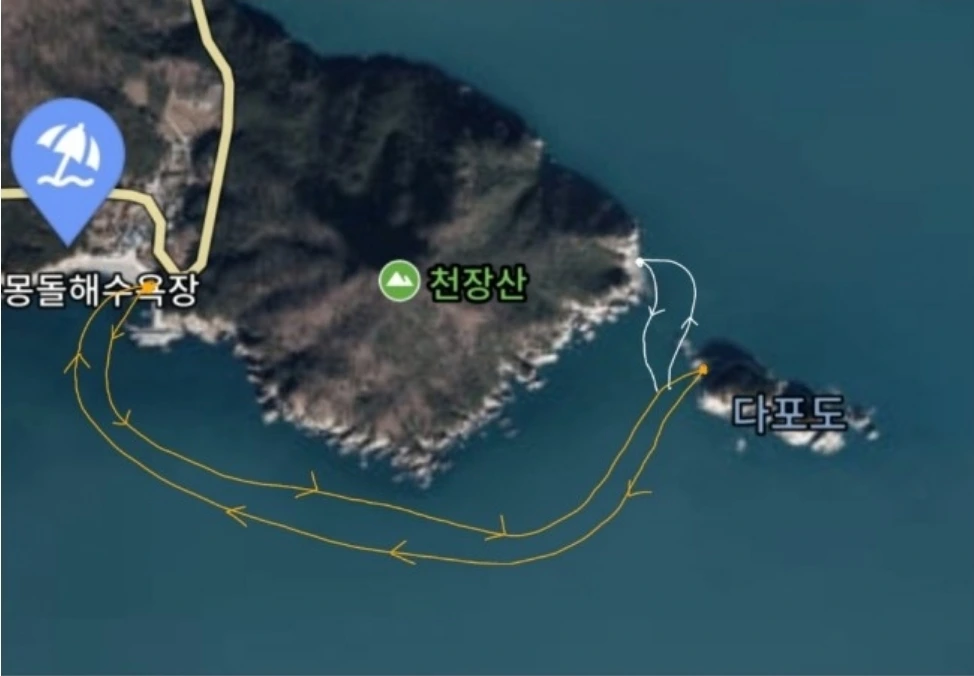 만약 파도가 높아 힘들다 판단되면 근처 몽돌 해변에서 잠시 쉬었다 오는 게 차선책(흰색)이기도 했다. 입수 후 느낀 파도의 높이는 과연 멀미를 동반할 만하고 결국 고민을 하다 중간에 경로를 바꿀 수밖에 없었다.