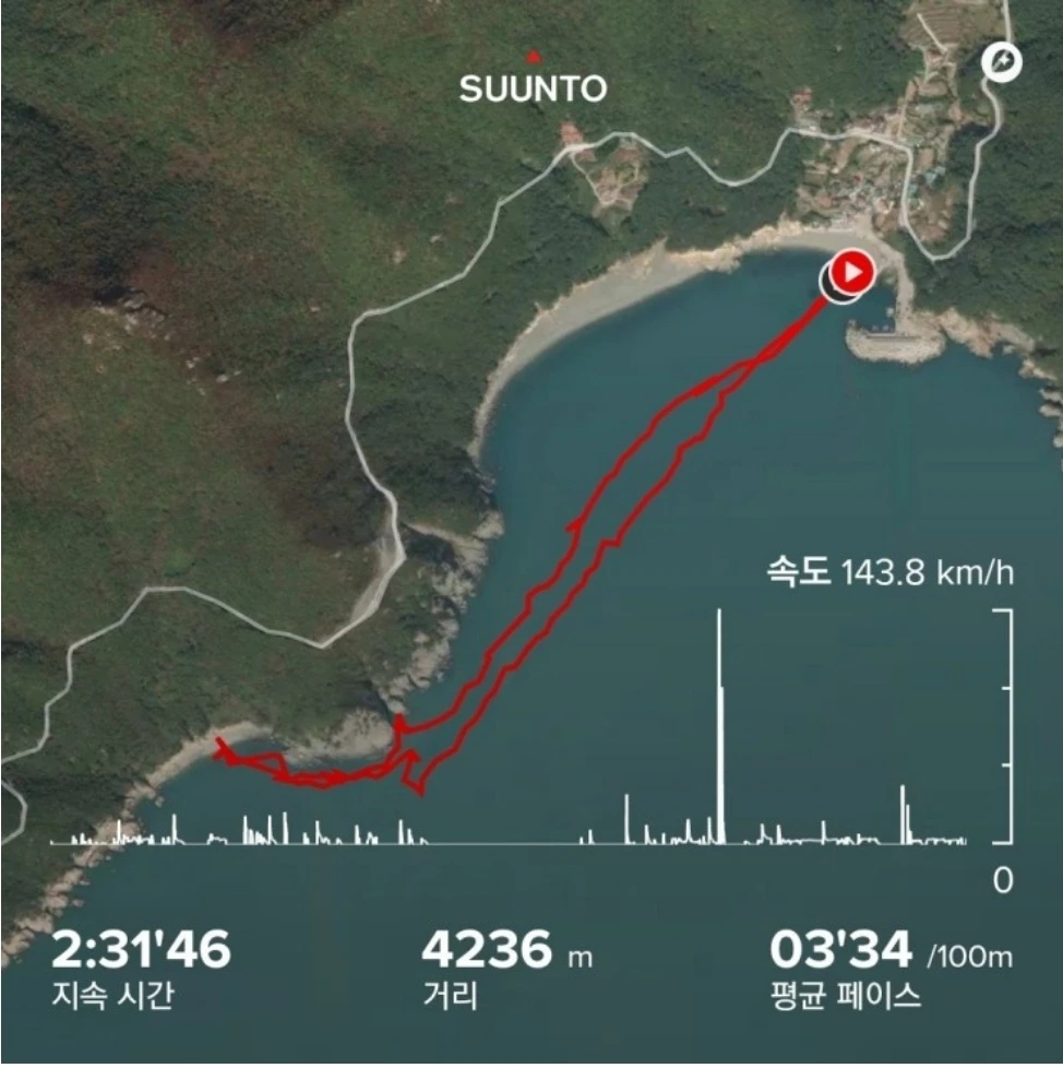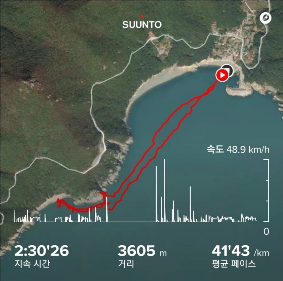 목적지이자 휴식 공간은 수영이 아니면 갈 수 없는 이름 없는 몽돌해변이다.(이런 곳을 찾아 다니는 재미가 쏠쏠하다) 반환점의 위치를 보니 아닌 게 아니라 사람이 갈 수 있는 교통로만 준비된다면 조그마한 몽돌 해수욕장이 생길법한 아담하고 아늑한 곳이었다.