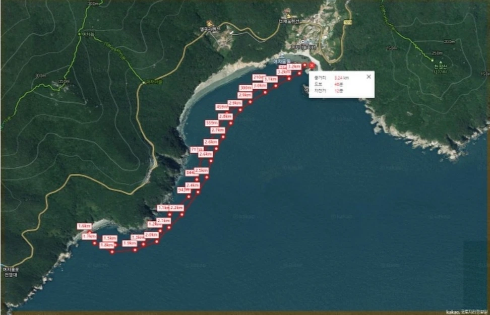 오늘의 목적지는 여차 몽돌 해수욕장에서 출발하여 오른쪽 해안의 절경을 따라 직선거리로 1.6킬로 지점 (수영을 해서 가다 보면 직선거리와는 제법 차이가 난다)에서 작은 몽돌 해변에서 잠시 쉬었다가 돌아오는 왕복 4킬로가량의 여정이다.
