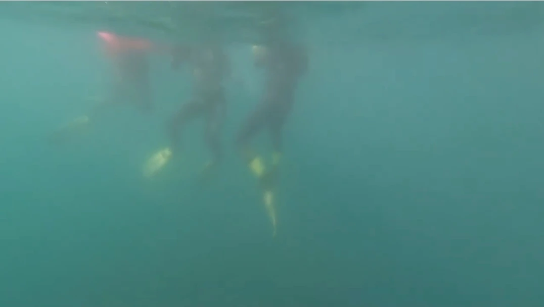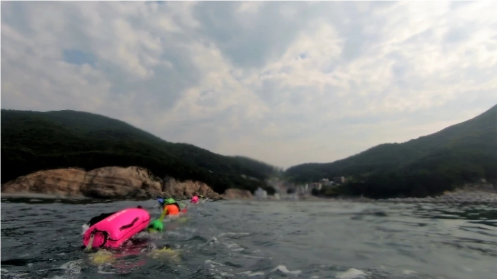 한참을 매료된 주변 경치를 감상하다가 돌아올 때는 언제나 그렇듯 거침없이 직진 특히 이번 여차부터는 일렬종대를 시도해봤다, 앞사람 부이나 오리발에 부딪히는 거품을 보고 뒤를 따르고, 길에 익숙한 리더가 제일 앞에서 방향을 잡고 속도를 조율하며, 체력적으로 강하며 가장 노련한 베테랑이 제일 뒤를 맡는다.