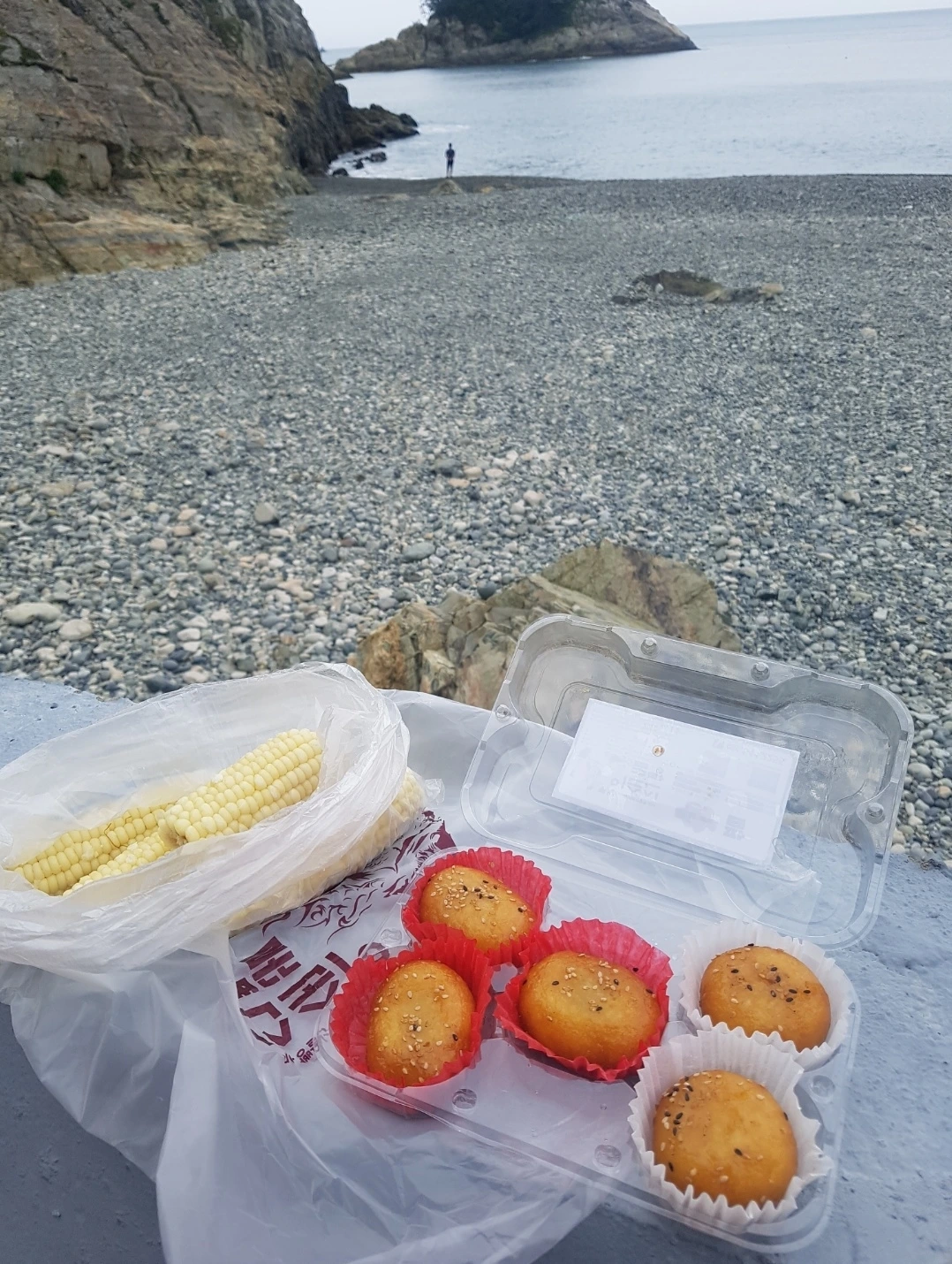 신선대 앞 작은 몽돌 해변으로 들어가니 비가 와서 그런지 약간의 한기가 느껴지지만 두런두런 살아가는 얘기들과 함께 커피와 당을 섭취, 이것 또한 꿀맛이다.