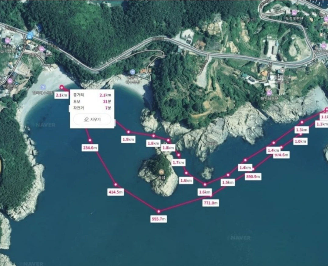 신선대 아래 작은 몽돌 해변은 함목해수욕장에서 직선거리로 1km 남짓 그리 먼 거리가 아니다. 하지만 조류와 파도에 떠다니다 보면 1.5km는 족히 나올 것이다. 왕복으로 따지자면 대략 2.5~3km의 거리인데, 그리 멀지도 않고 거리만 보면 그리 심심하지는 않을 것 같다.