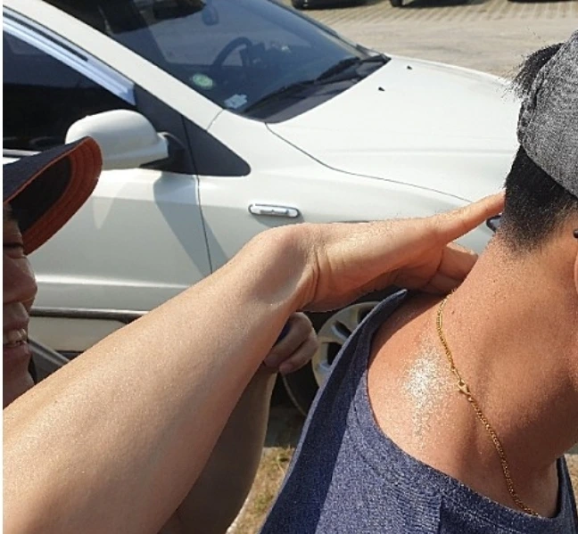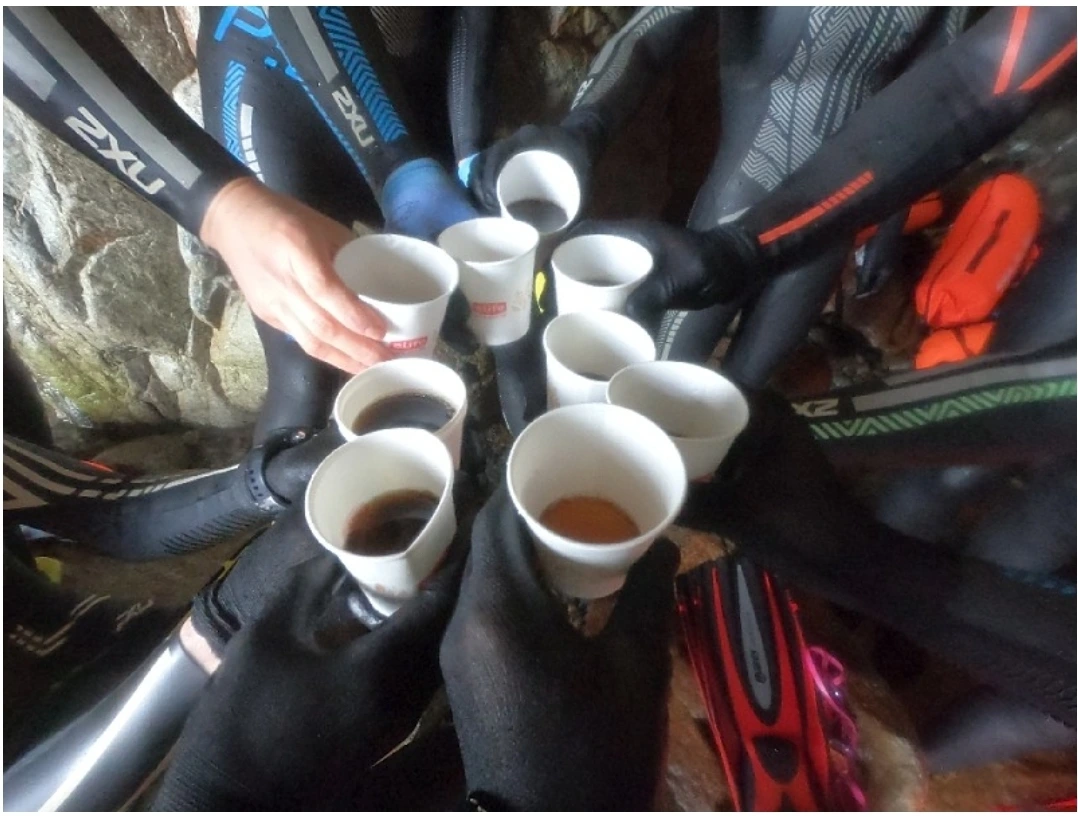 슈트 등 뒤의 지퍼도 채워 주시고, 목 어깨 근처에 바셀린을 손수 발라 주시며 (바셀린은 슈트에 쓸린 피부를 보호하는데 제격이다), 부이를 직접 불어 주시기까지 한다.