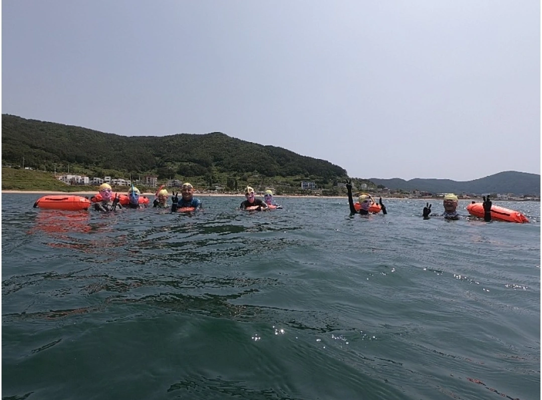 수영을 한지는 나름 오래되었지만, 바다 수영은 완전 초짜라 바다에서 정면으로 숨 쉬는 법, 깊은 바다에서 쉽게 적응하는 법, 앞사람 오리발이나 부이 따라가는 법, 스노클 사용 방법, 비상 상황 발생 시 구조 요청 법 등 선배님들의 가르침이 장난이 아니다.