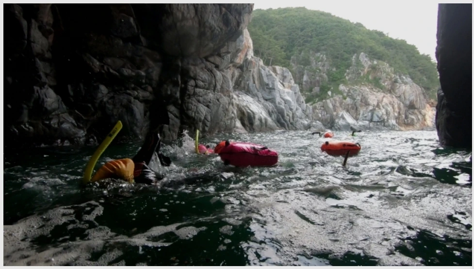 앞서가는 동료를 뒤에서 따라가기보다. 해안선을 조금 멀리 돌더라도 동료들을 오른편으로 보면서 측면 호흡으로 가는 게 스노클 없이 편하게 따라갈 수 있는 방법이라 생각했다.