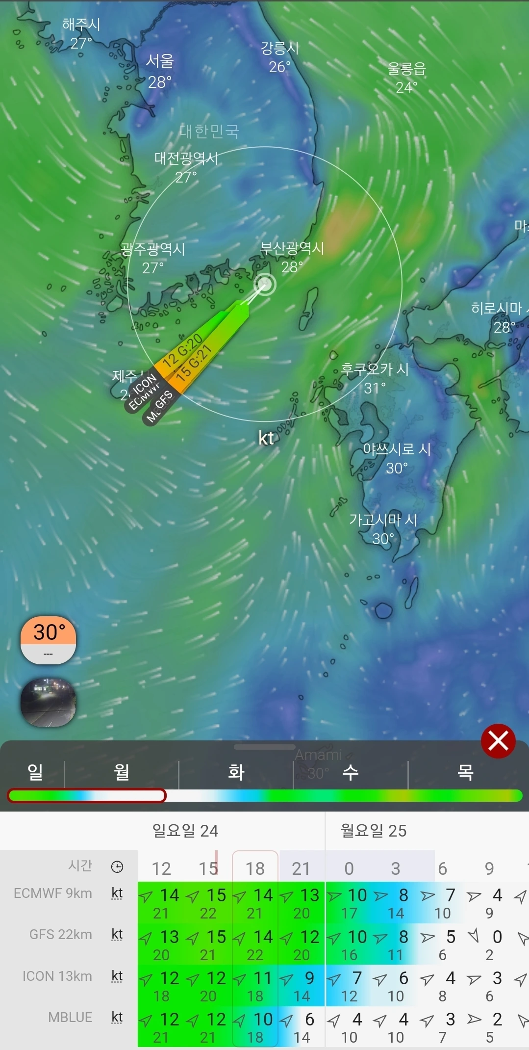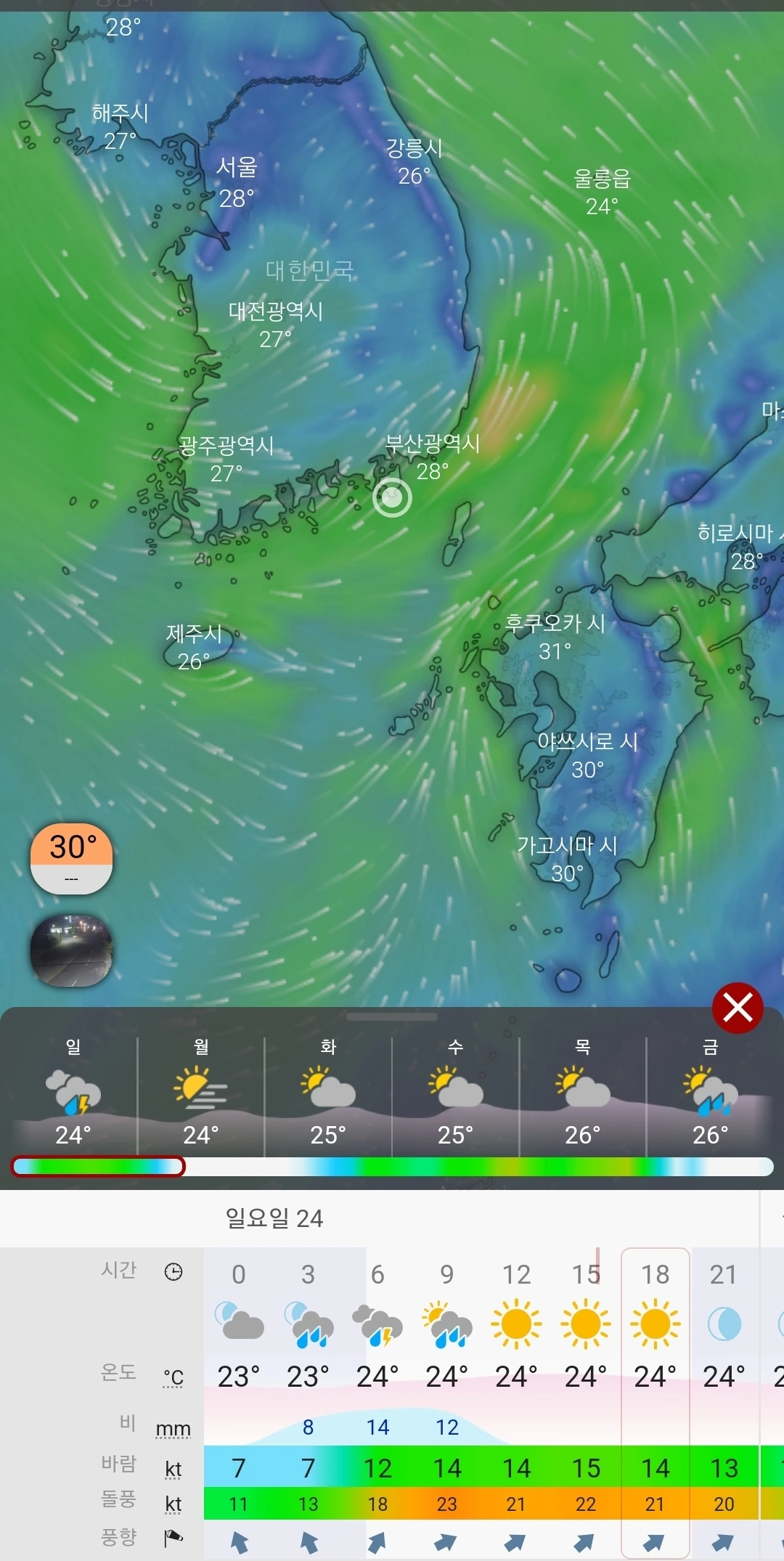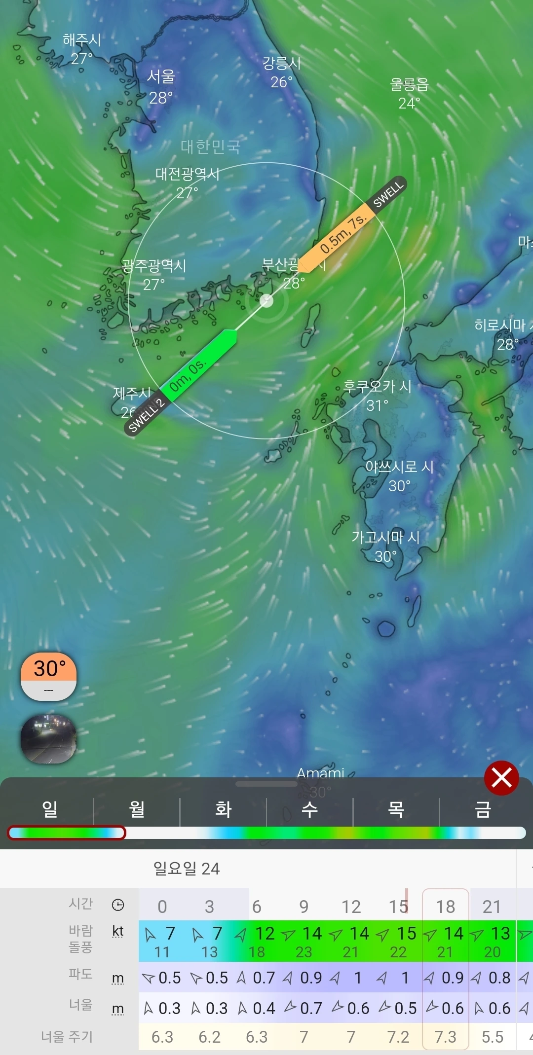 일주일 내 바다 날씨를 보았다. 경험상 가장 확도가 높은 바다 날씨 앱은 Windy이고 바다수영 추진 여부를 기상청 예보와 함께 참고하는 편이다.