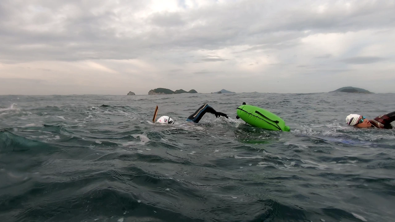 호루라기는 고깃배가 지나갈 때 혹은 대형가 간격이 너무 벌어졌을 때 모으는 역할을 하는데, 수영에 집중하다 보면 잘 안 들릴 때도 있다. 경험 많은 리더의 리딩에 잘 따르는 팀워크가 더 중요하다.