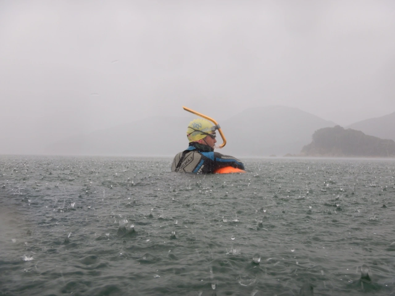 바다 수영을 하면서 날씨 때문에 애를 먹은 적이 한두 번이 아니다. 육지 날씨는 바람 한점 없이 고요한데 해변에만 가면 출렁거리는 파도로 멀미를 느낀 적도 있고 갑자기 예보에도 없는 비가 오는 바람에 시원한 비를 맞으며 바다 위에서 인생 샷을 찍는 행운을 맞은 적도 있다. (바람과 파도가 없는 상태에서 바다 비는 이른 봄과 늦가을 출수 후 체온을 떨어뜨리는 어려움만 없다면 더할 나위 없이 반가운 손님이다.)