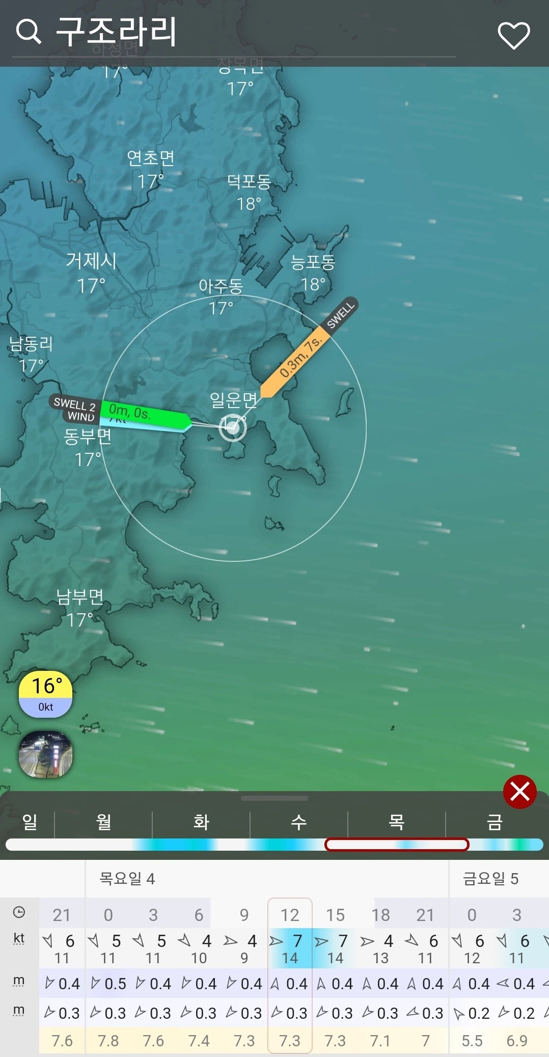 요즘은 날씨 앱이 참 잘되어 있는 것 같다. 기상청 앱이 아니라도 풍속과 파고를 예측할 수 있는 앱이 다양하게 잘 나와있고 제법 높은 확률로 예고가 적중하는 것 같다