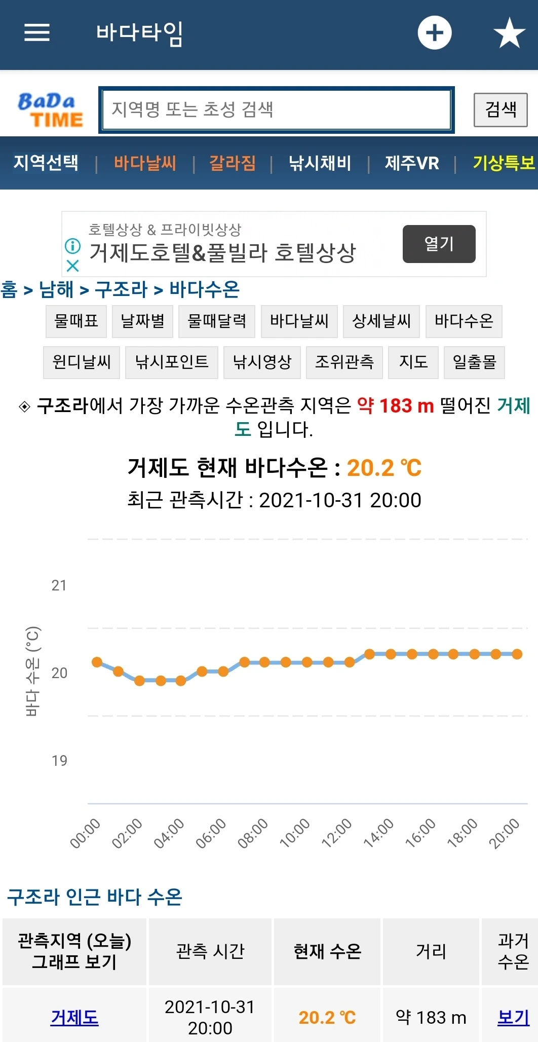 수온은 바다 타임 앱으로 검색을 하는데, 현재 수온만 공유하기 때문에 3~4일 뒤의 수온은 매일 앱에 들어가 확인할 필요가 있지만, 수온은 기온과는 다르게 급격히 떨어지거나 올라가는 일이 없어 보통 3~4일 뒤라면 현재 수온 대비 많아야 0.5도 정도 차이가 난다고 보면 된다.