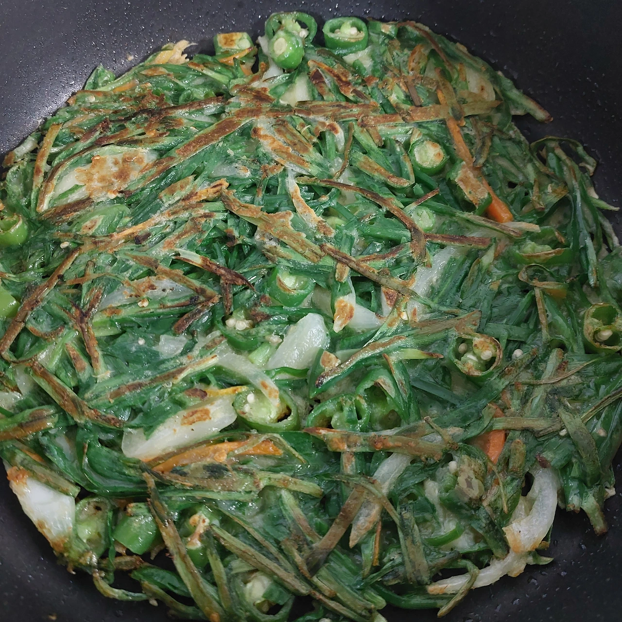 먼저 부침가루와 튀김가루를 6:4 비율로 반죽을 준비합니다. 그럼 전이 더 바삭하고 맛있어지거든요. 여기에 깨끗이 씻은 부추를 먹기 좋은 크기로 썰어 준비하고, 청량고추도 15개 정도 썰어 준비합니다. 양파와 당근도 채 썰어 주면 완벽합니다. 반죽이 완성된 후 미리 예열한 프라이팬에 적당량의 기름을 두르고 반죽을 얇고 얇게 펴 올려 줍니다. 두꺼운 전을 좋아하시는 분들도 많겠지만, 간단 씨와 아무거나 군은 얇은 전을 좋아합니다.