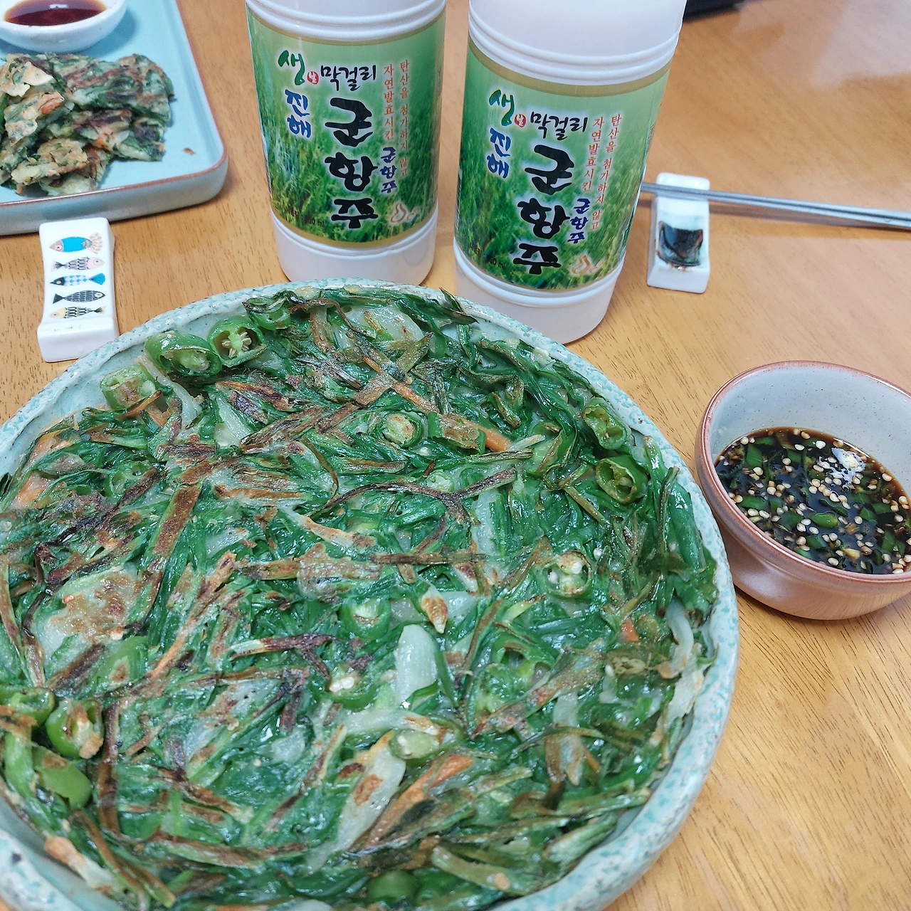 아무거나 군은 매운 걸 못 먹으니 청양고추를 넣지 않은 부추전을 만듭니다. 저희 부부는 아주 듬뿍 넘치듯 넣은 청양고추와 부추로 노릇노릇하고 바삭하게 전을 만들어 먹었습니다. 여기에 간단 씨의 필수템 막걸리도 빠지면 안 되겠죠. 우리는 가격에서도 자유롭고 맛은 훨씬 좋은 부추전으로 가족의 행복한 저녁상을 차려냈습니다.