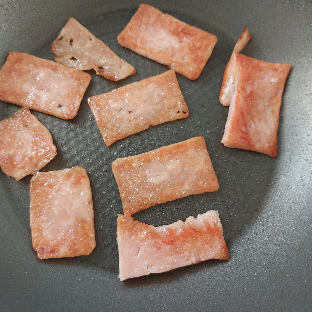냉장고에 있는 딱 세 개 남은 계란과 우유, 치즈 2장도 꺼냈습니다. 큰 볼에 계란을 깨트려 넣고 우유 조금, 설탕 1스푼, 소금 1 작은 스푼, 후추 조금을 넣고 고루고루 섞어 준비합니다. 여기에 텃밭에서 막 뜯어 온 대파를 쫑쫑 썰어 넣어 줍니다. 통조림 햄도 꺼내 필요한 만큼 썰어 노릇노릇 앞뒤로 구워놓습니다. (솔직히 샌드위치 용 햄 대신입니다.)