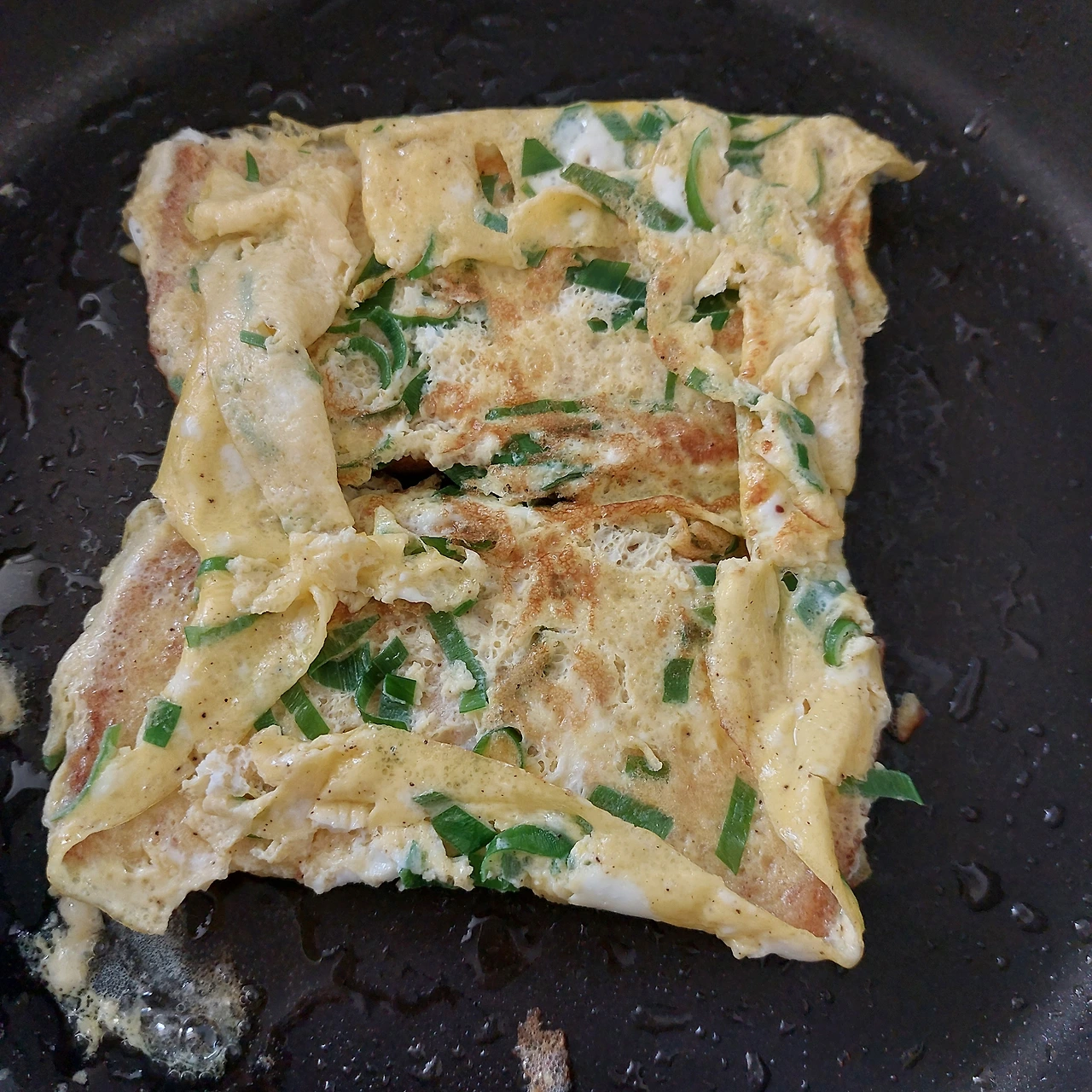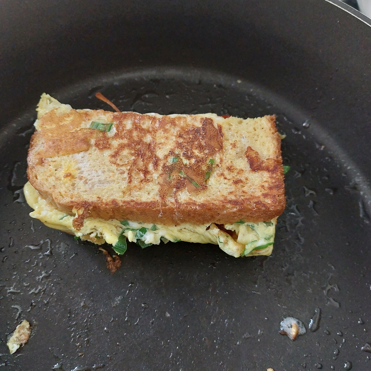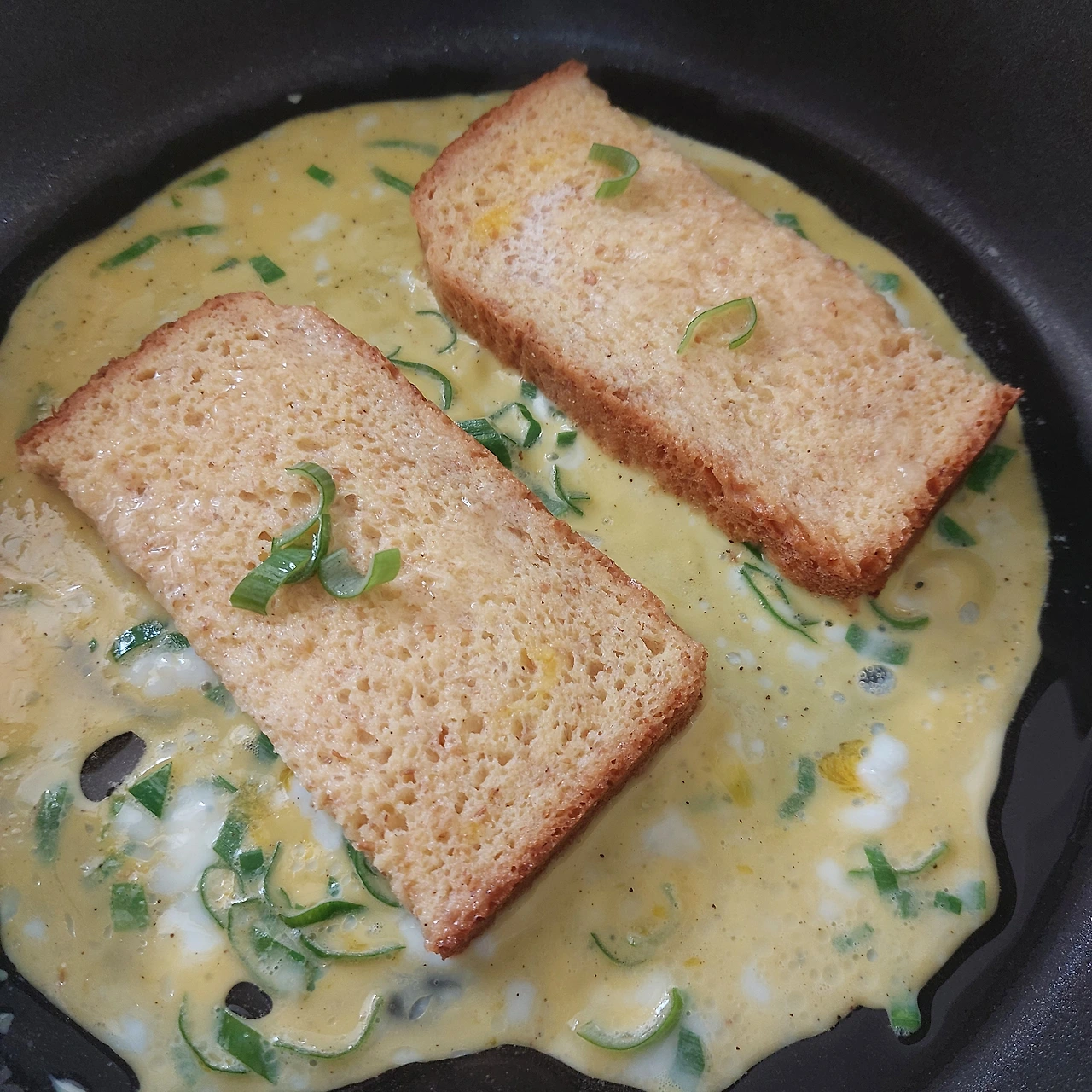 그럼 본격적으로 샌드위치를 만들어 보겠습니다. 저에게 요리는 대체 가능이라고 했습니다. 버터를 녹여 계란물과 빵을 구우면 풍미가 더 좋지만 현재 저의 집에는 없습니다. 그러니 식용유를 이용할 밖에요. 미리 예열한 프라이팬에 적당량의 기름을 두르고 계란물을 부어 고르게 펴 줍니다. 그 위에 반 자른 빵을 사이좋게 나란히 놓습니다. 이때 빵의 한 면을 계란물에 적셔 뒤집어 놓는 게 중요합니다. 그래야 뒤집어 구울 때 계란 물이 입혀져 더 촉촉하고 노릇노릇한 먹음직스러운 때깔이 나옵니다.