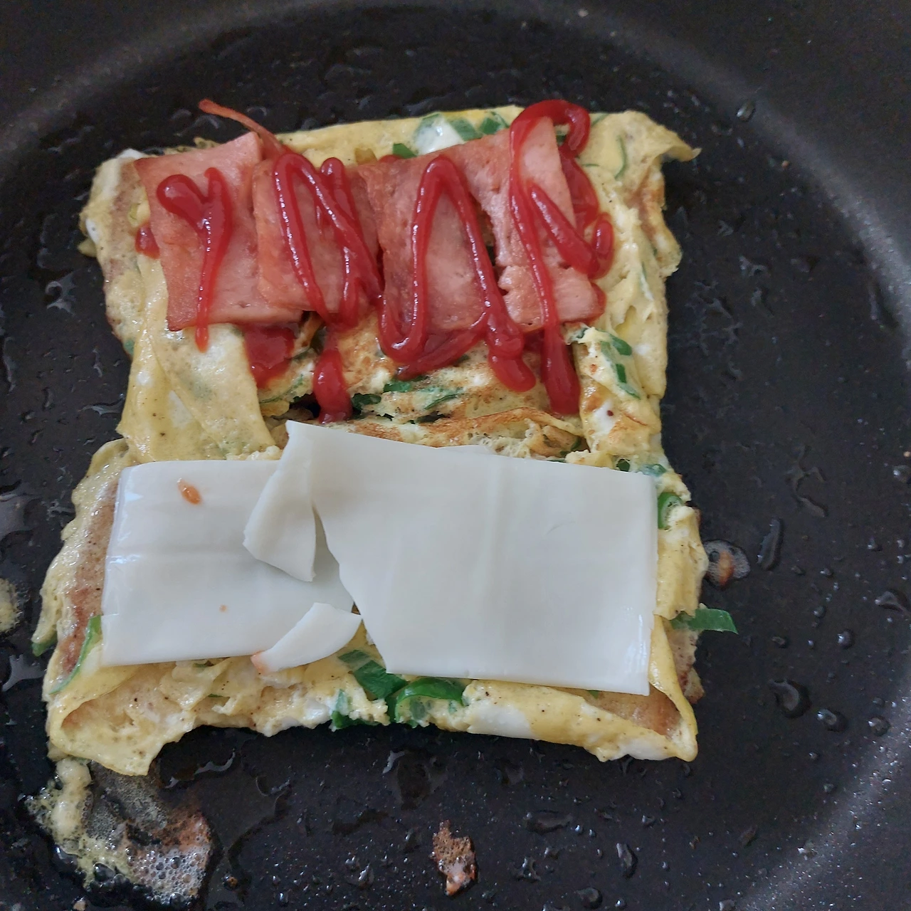 적당히 계란이 익었다 싶으면 뒤집어 주세요. 뒤집어서 펼쳐진 계란을 빵 위로 다소곳하게 모아 줍니다. 그럼 토스트 그대로의 모습과 속에 꽉 찬 느낌까지 좋아요. 계란을 다 모았다면 미리 구워놓은 햄을 가지런히 올리고 냉장고에 굴러다니는 케첩을 찍 짜 뿌려줍니다. 반대편에는 뽀얀 체다치즈를 올려줬습니다.