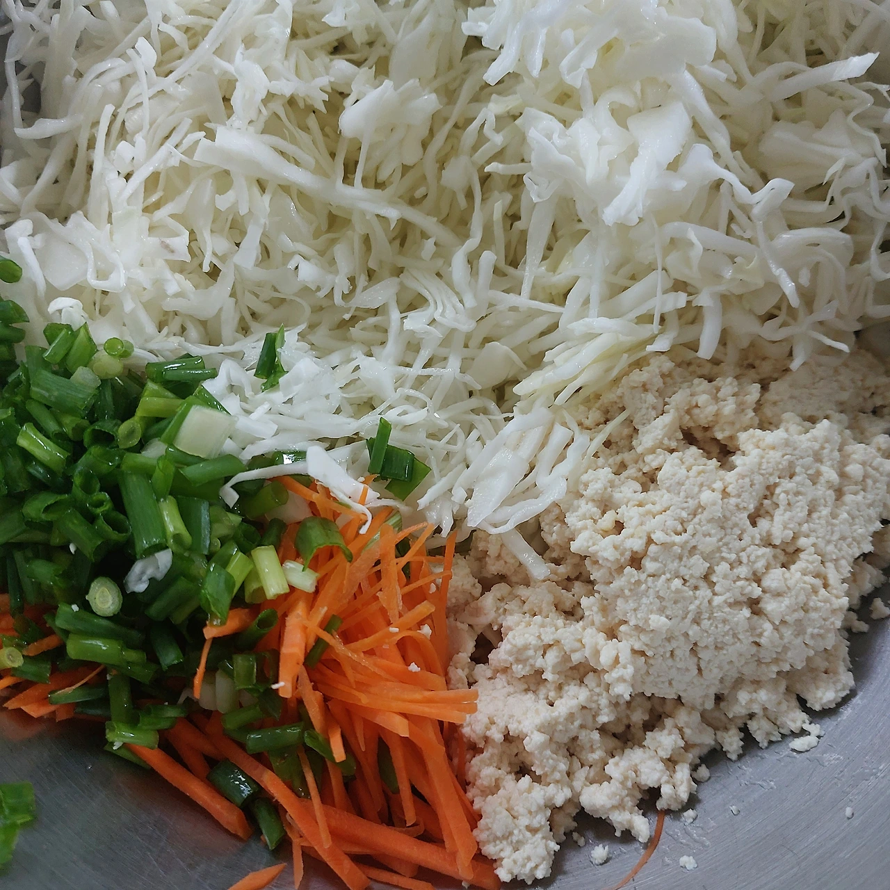 1. 양배추, 당근, 쪽파를 썰어 준비합니다.