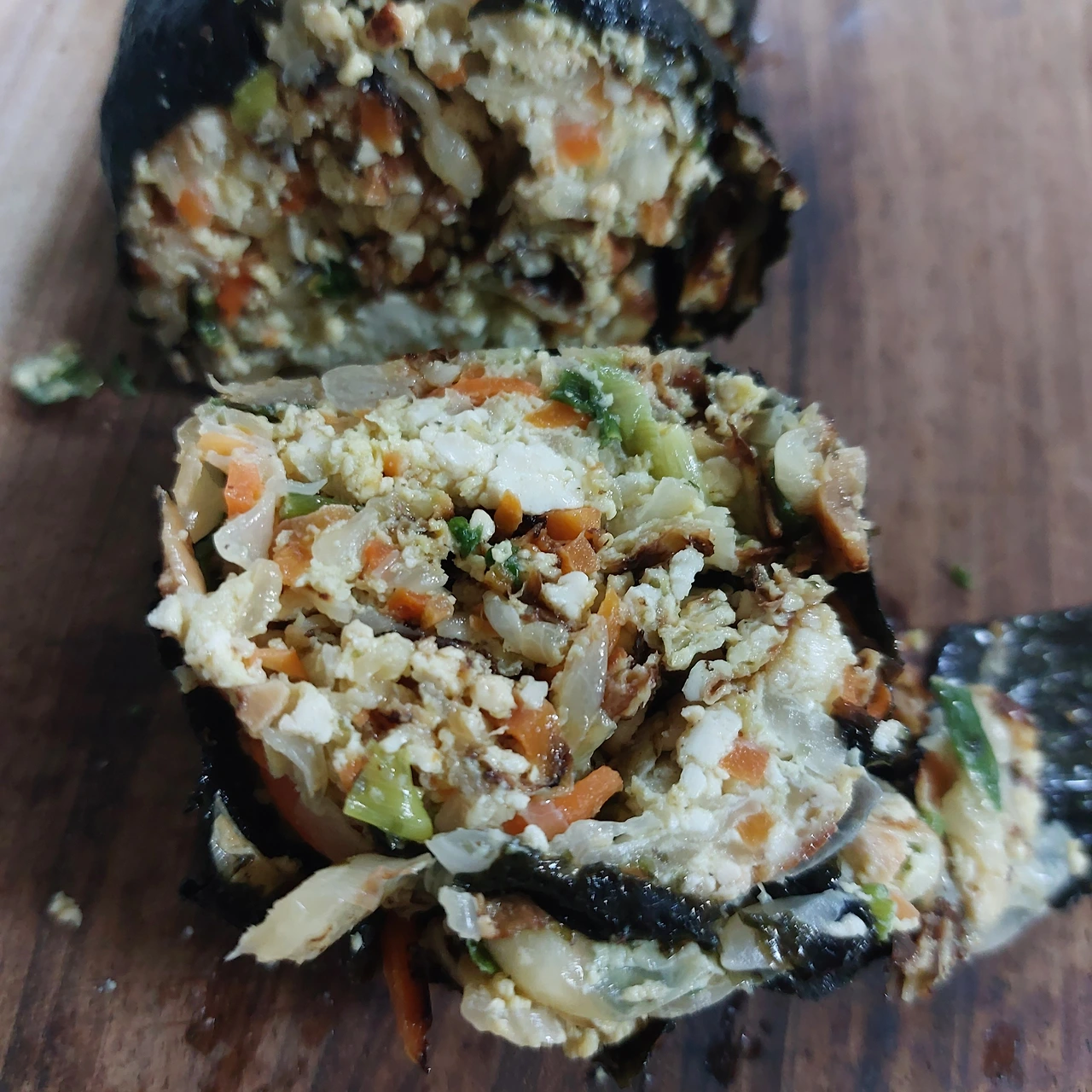 이런, 이게 눈으로 보는 것만큼 만만치 않습니다. 볶고 구워 돌돌 말기까지 과정은 간단했지만 볶은 두부의 수분이 완벽히 제거되지 않았고, 계란만으로 모든 재료를 조화롭게 어루러기에도 역부족이었습니다. 또, 채소 각자가 포기하지 않고 지닌 수분은 서로를 밀어냈습니다.