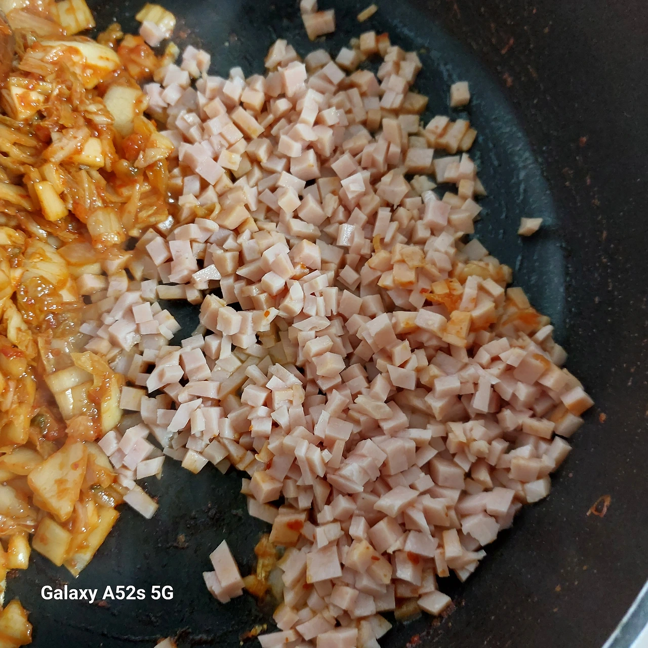 6단계 적당히 볶아진 김치는 살짝 한편에 밀어 놓고 햄을 볶아 줍니다. 그러다 햄이 적당히 익었다 싶으면 합체가 이루어집니다. 이때의 냄새는 기름에 볶아진 김치와는 차원이 달라집니다. 확실히 맛이 배가됩니다