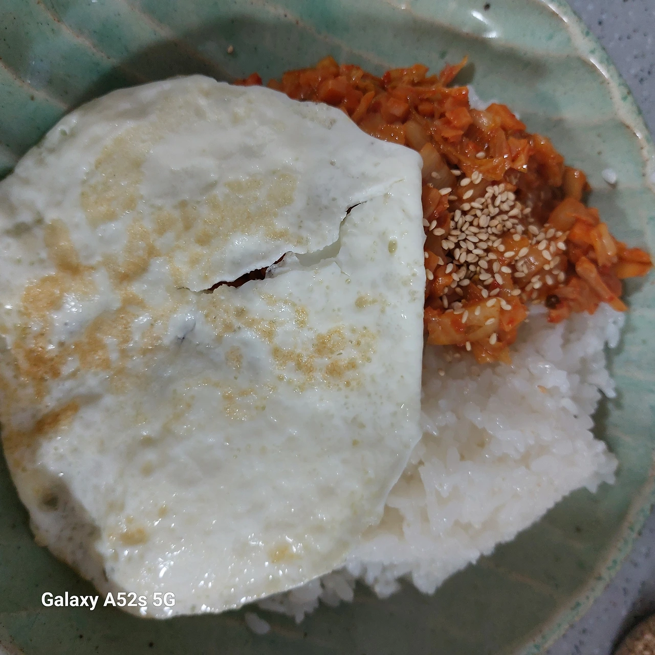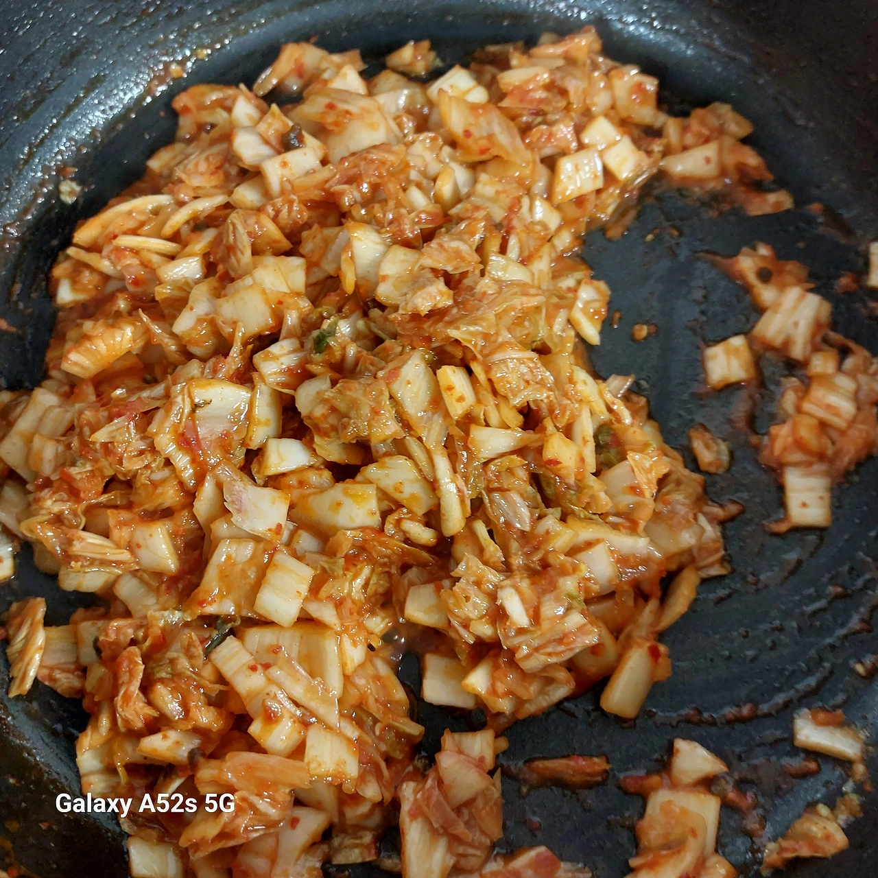 5단계 노릇노릇 잘 구워진 계란 프라이를 접시로 옮기고, 남아 있는 기름에 김치를 볶습니다. 적당량의 기름이 들어가야 맛이 더 좋아지는 것은 매직입니다.