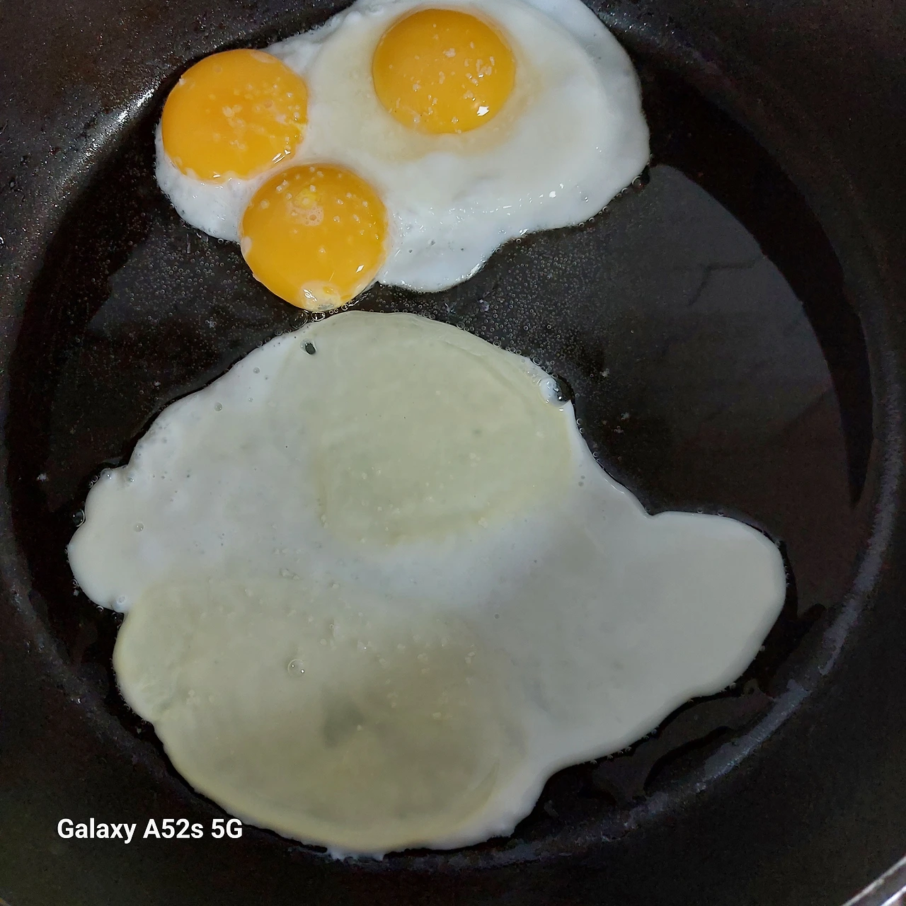 3단계 큰 프라이팬을 꺼내 기름을 적당량 두르고 계란 프라이를 합니다. 아참! 미리 노른자와 흰자를 분리합니다. 계란 노른자는 텁텁해 싫다는 작은 남자를 위해서입니다.