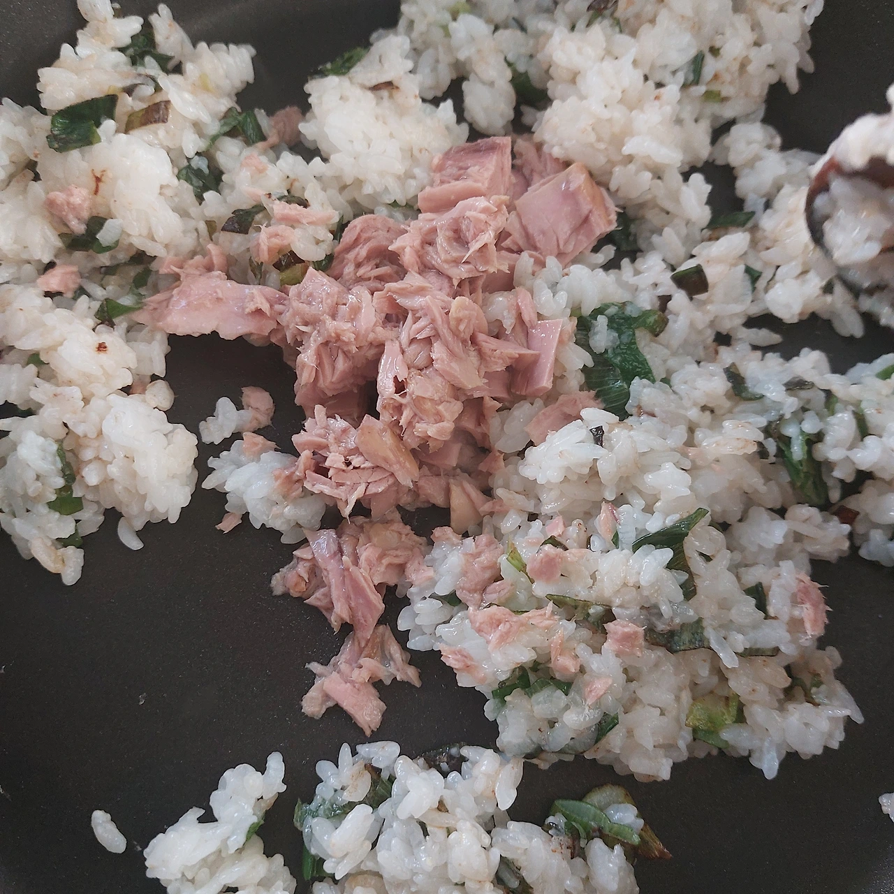 둘의 식감의 차이는 어마무시합니다. 그래서 아무거나 군이 먹은 참치볶음밥에는 아깝게도 파만 남았습니다.