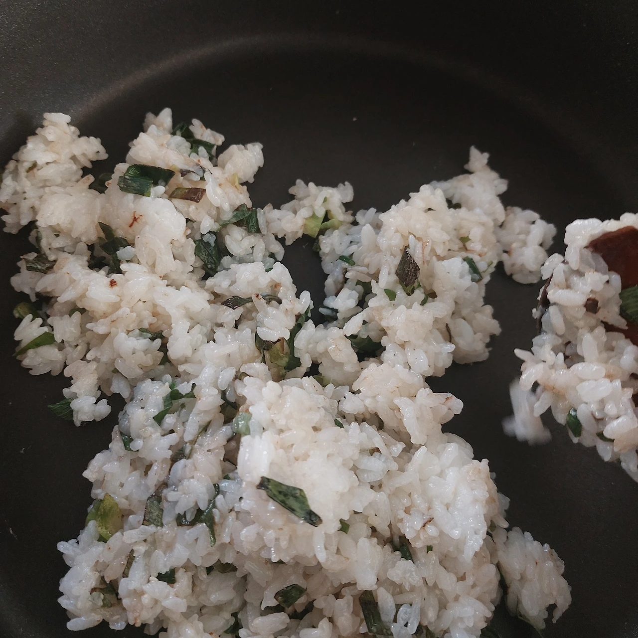 파기름이 적당히 완성되었으면 밥을 넣고 골고루 볶습니다. 밥에 파기름을 입히는 과정입니다.