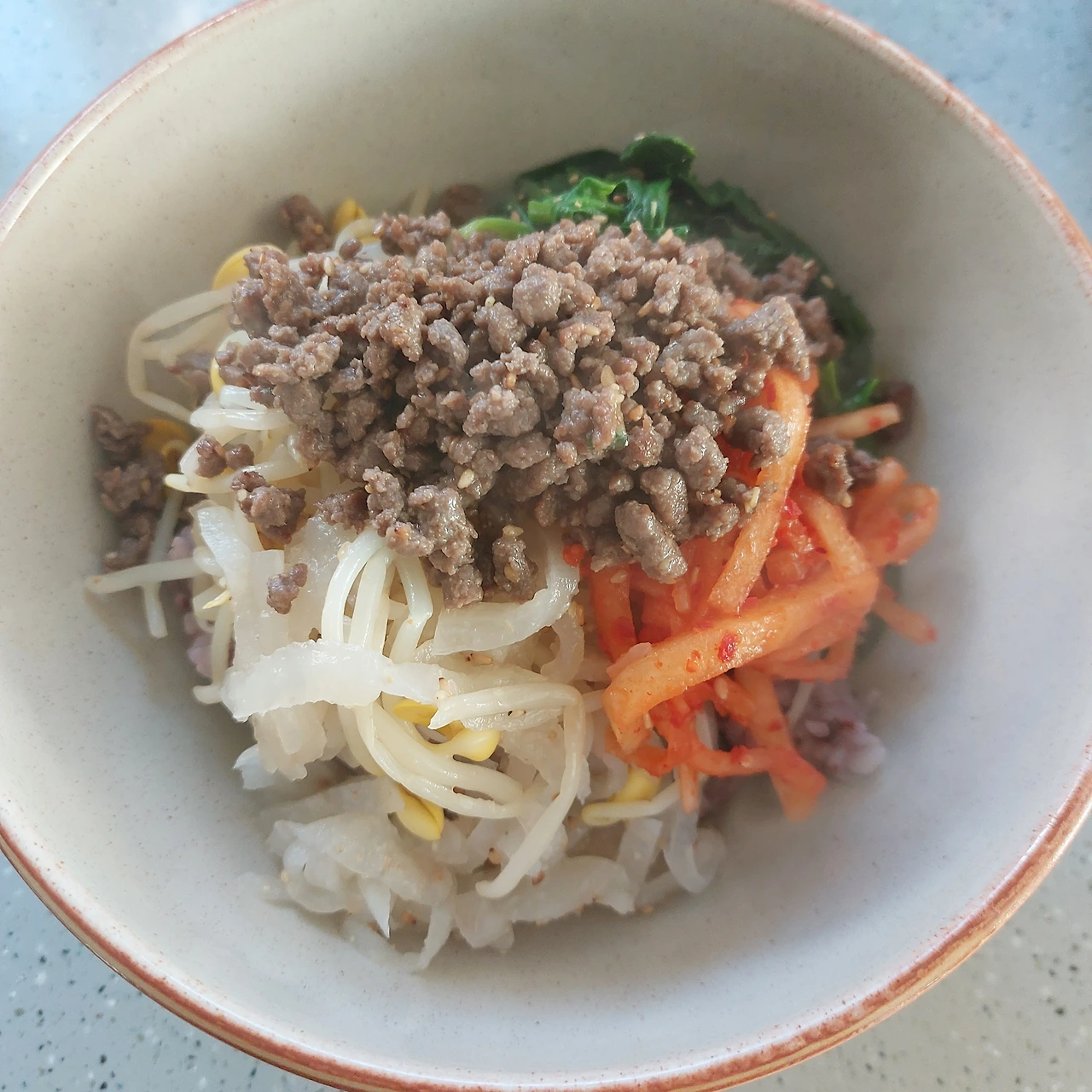 떡국의 고명으로 만든 고기볶음도 당분간 사용할 수 없어 비빔밥 위에 살포시 올려 먹스럽게 담아냈습니다.
